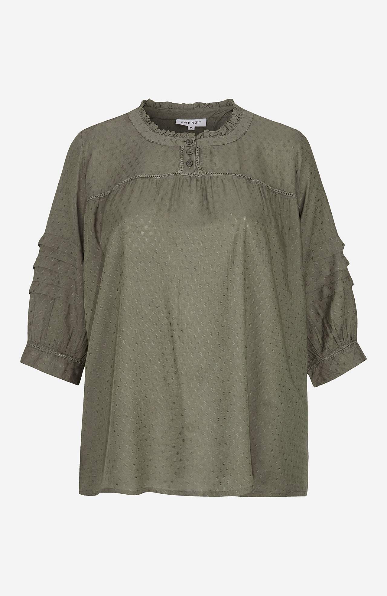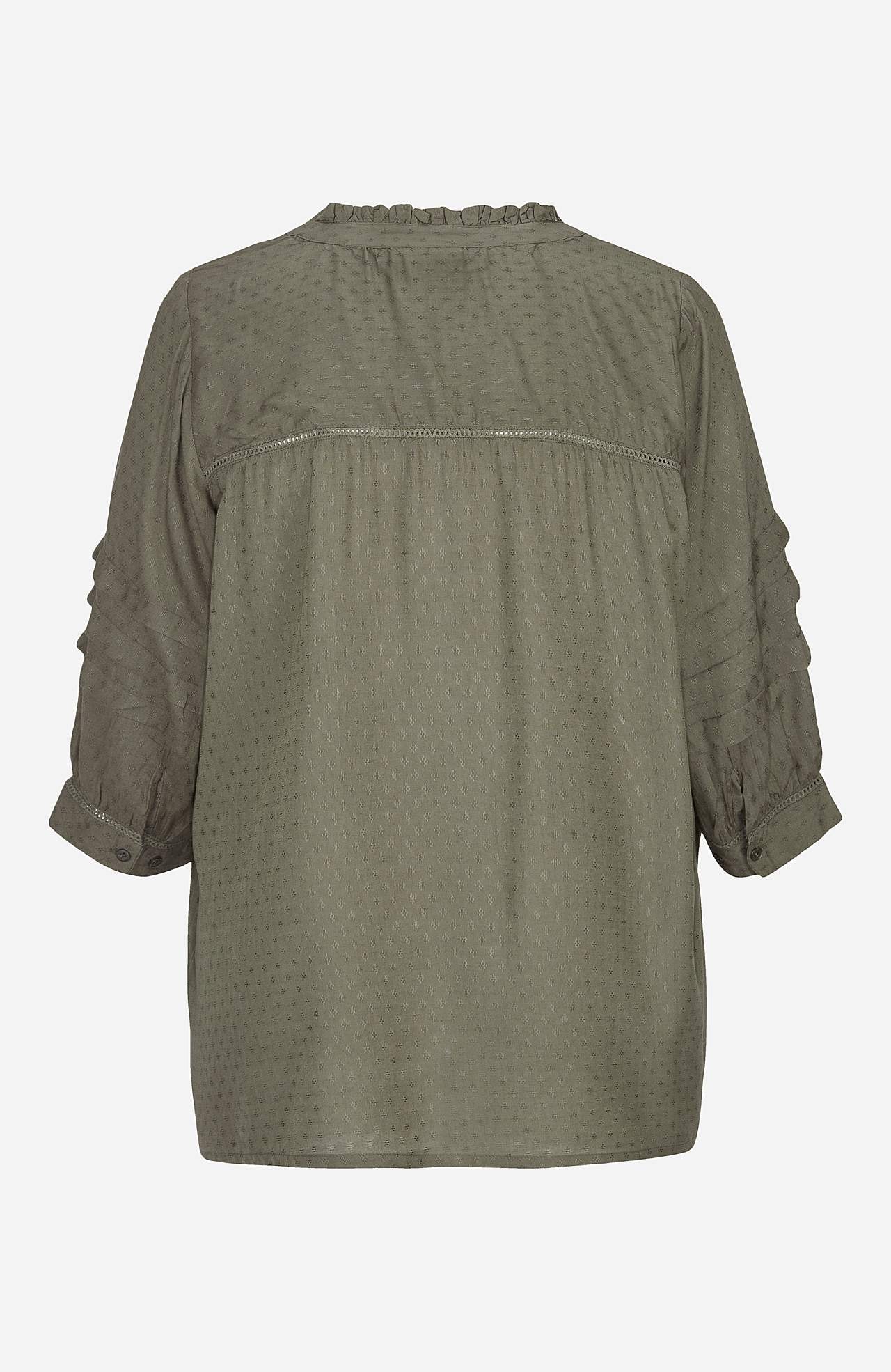 Bluse med dekorative hullbroderier og vevet strukturmønster. Rundhalset med tynn volangkant og tre knapper. Romslig passform. 3/4-lange, vide ermer med fine folder og tynn, justerbar mansjett i ermeslutten. Rett fald. Lengde fra skulder ca. 77 cm i størrelse M (46/48).