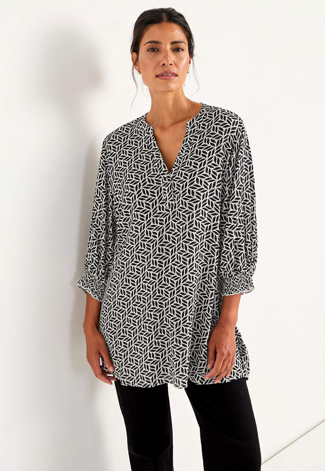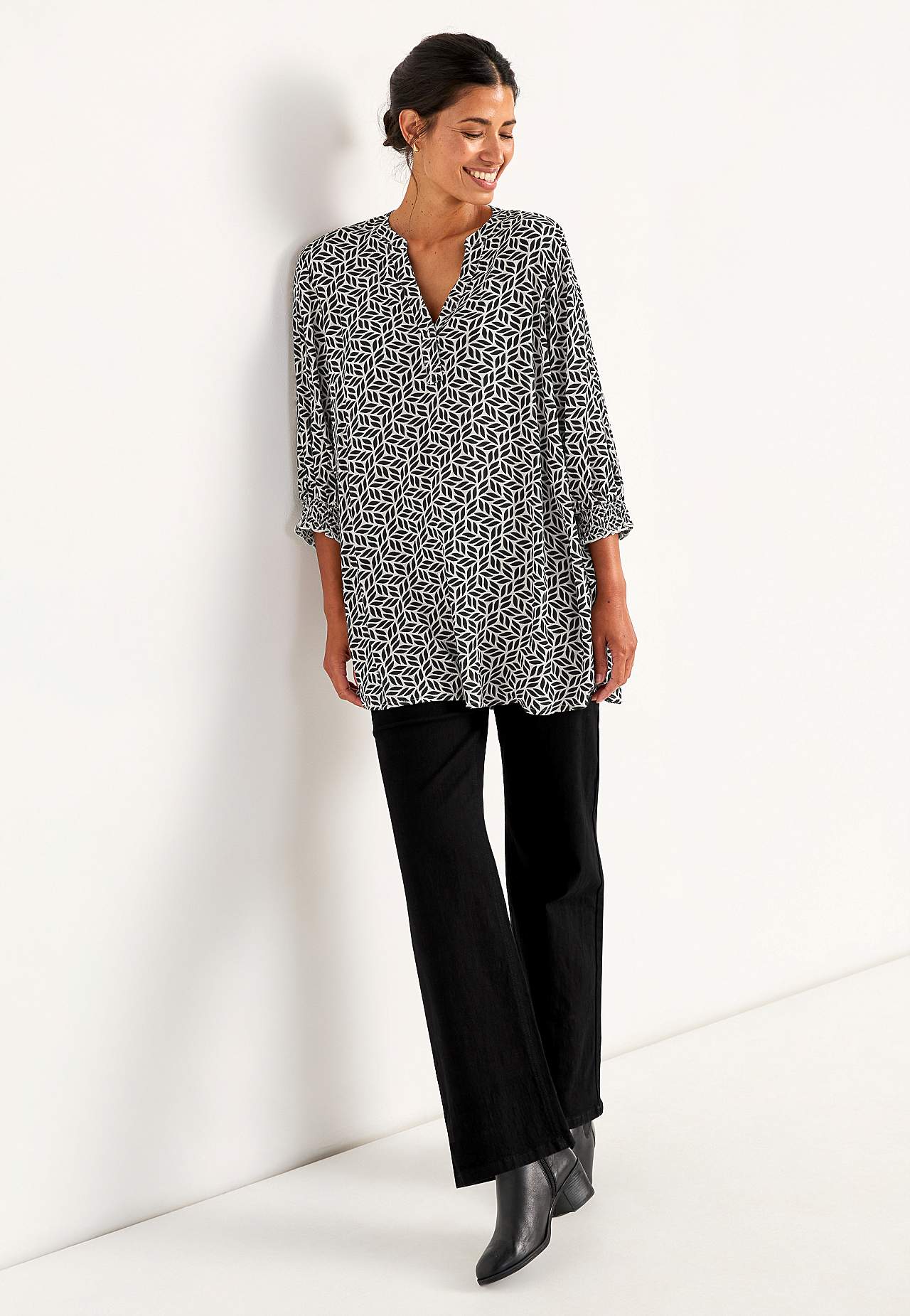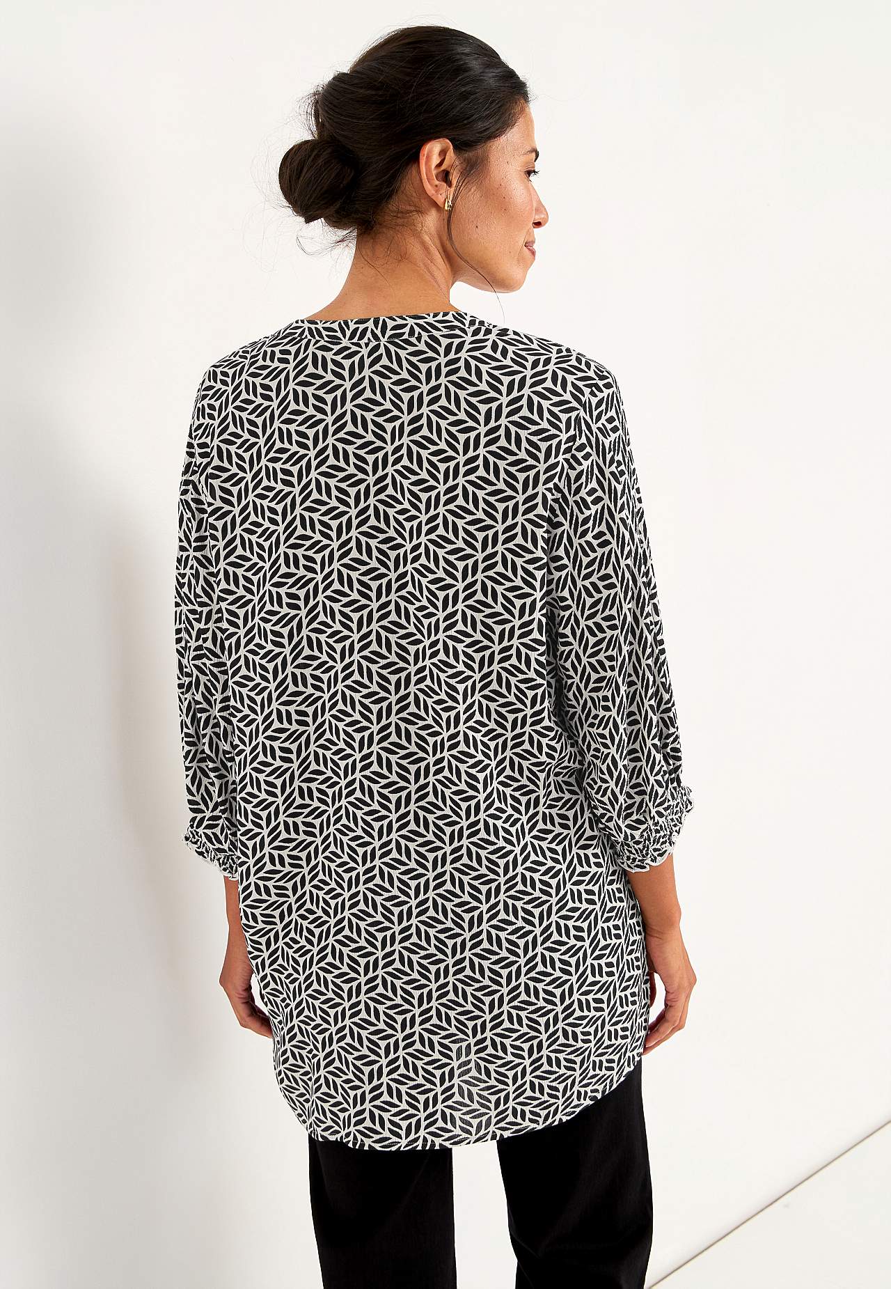 Vevet, crepe tunika. Romslig passform. 3/4-lange ermer med vaffelsøm på enden av ermene. Lengden følger størrelsen, ca. 78-88 cm fra skulderen.