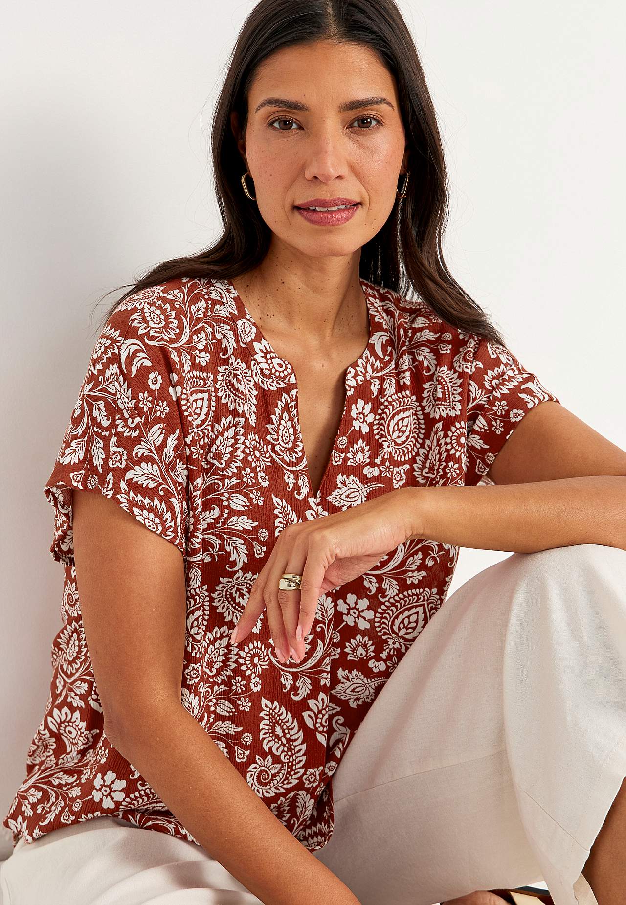 Luftig, kjølende materiale med matt overflate og fin struktur. Noe romsligere passform. Avslappet, drapert fold foran. Korte korte ermer. Avrundet fald. Matche gjerne med 620625, 702448. Rygglengden følger størrelsen, ca. 64-76 cm.