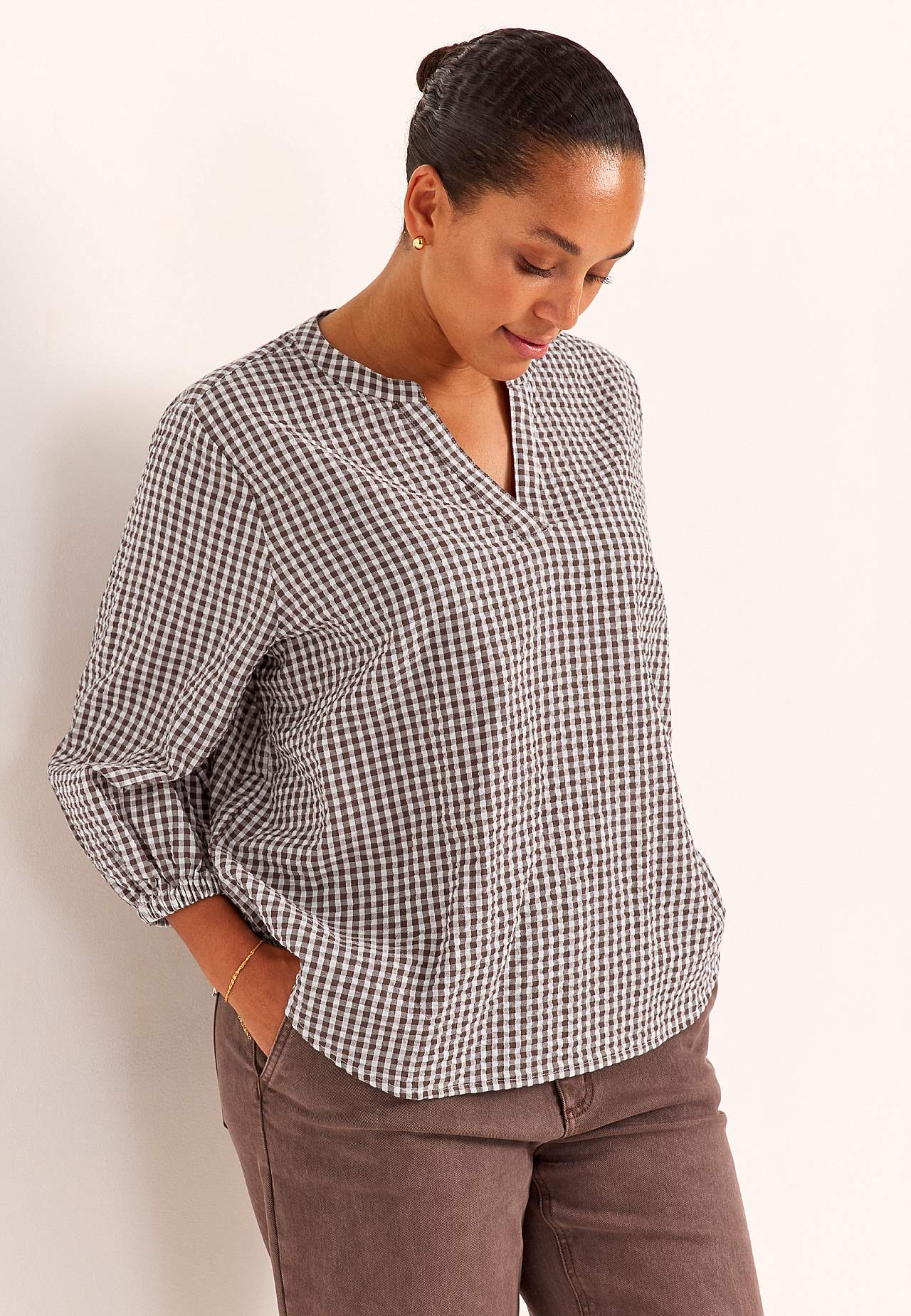 Vevet, luftig bluse med garnfargede, små ruter. Normal passform. Nydelig materiale i seersucker. V-halset, overlappet hals. Knappslag med kledde knapper. 3/4-lange puffermer med strikk i ermeslutten. Lengden følger størrelsen, ca. 61-78 cm fra skulderen.