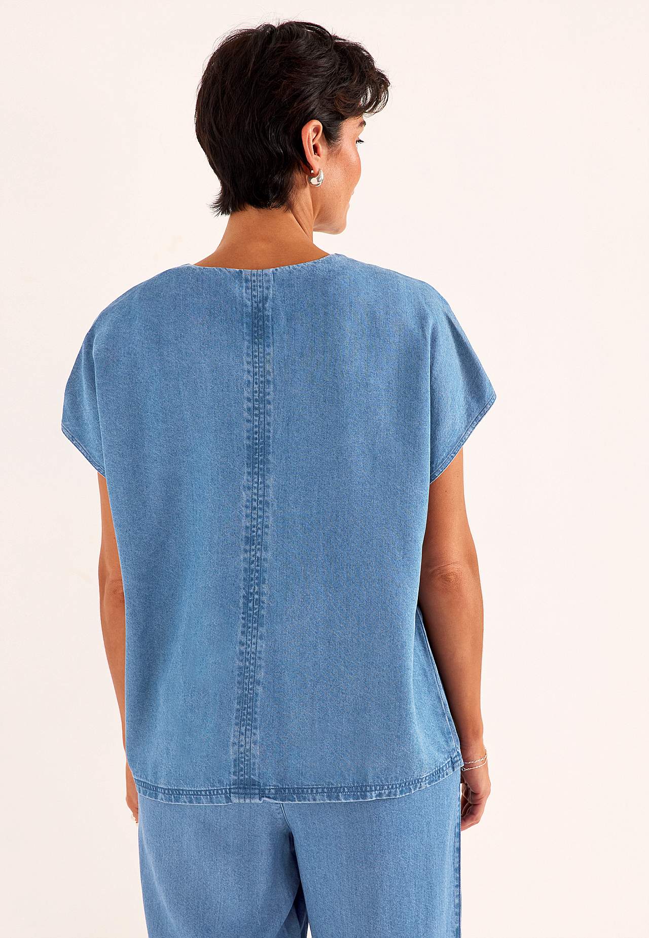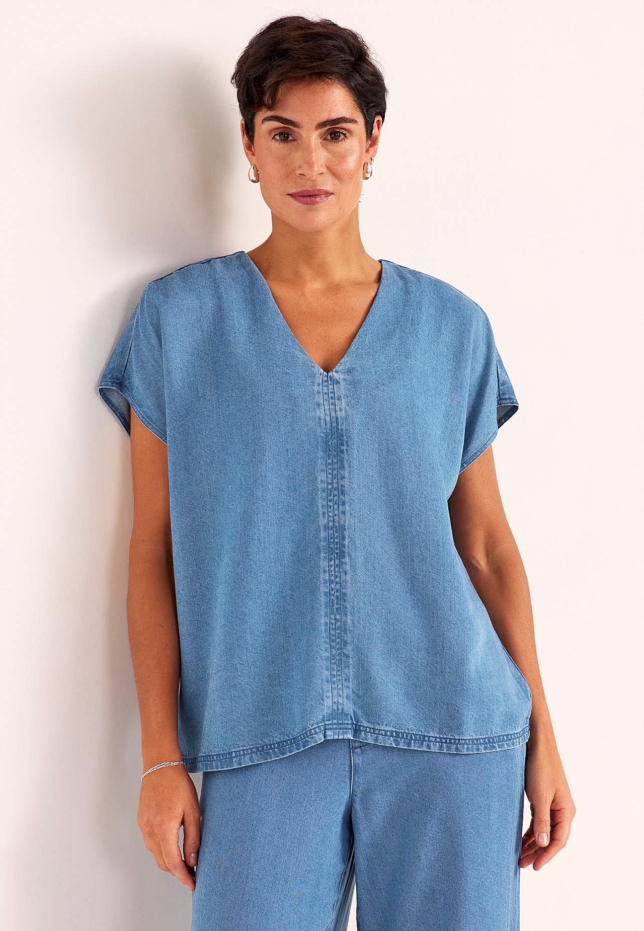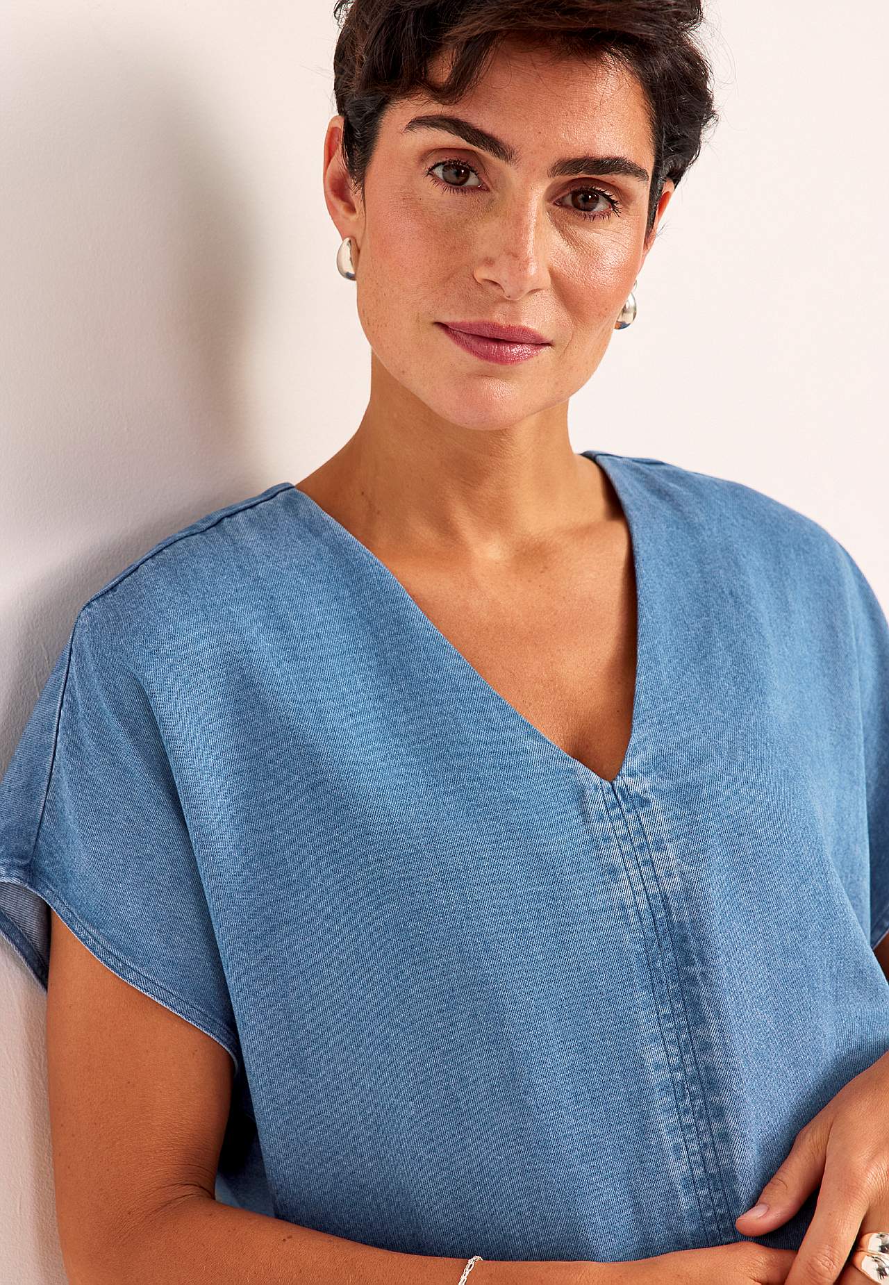 Bluse i denim med en myk, fantastisk behagelig lyocell. Stilrent, enkelt design. Jevnt materiale med fint fall. Rett, oversized passform. V-halset hals og fine detaljsømmer foran og bak med en senteren. Korte korte ermer. Lett avrundet fald. Matche gjerne med 701542. For at plagget skal gjenfå sin myke følelse anbefales tø... Les mer