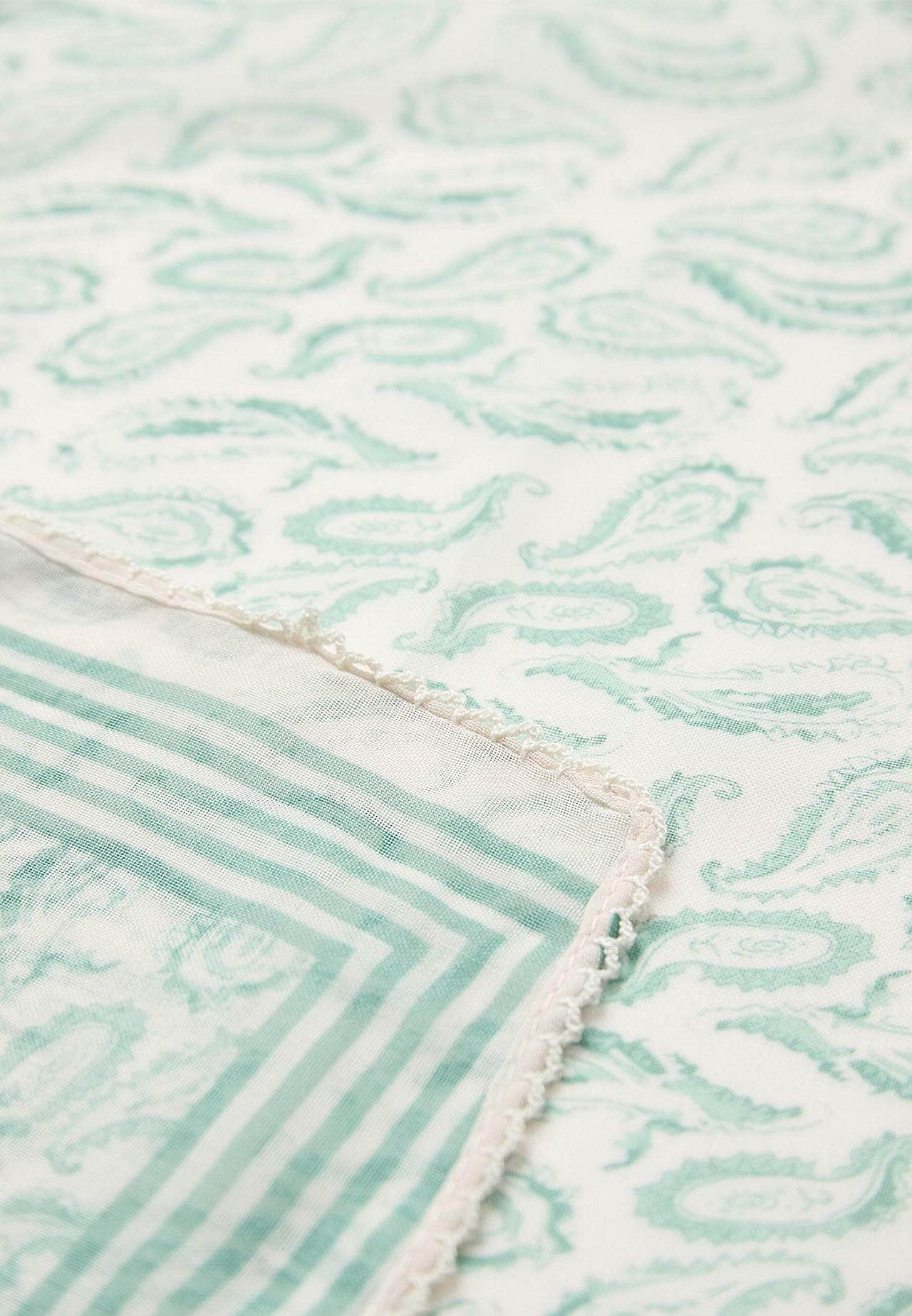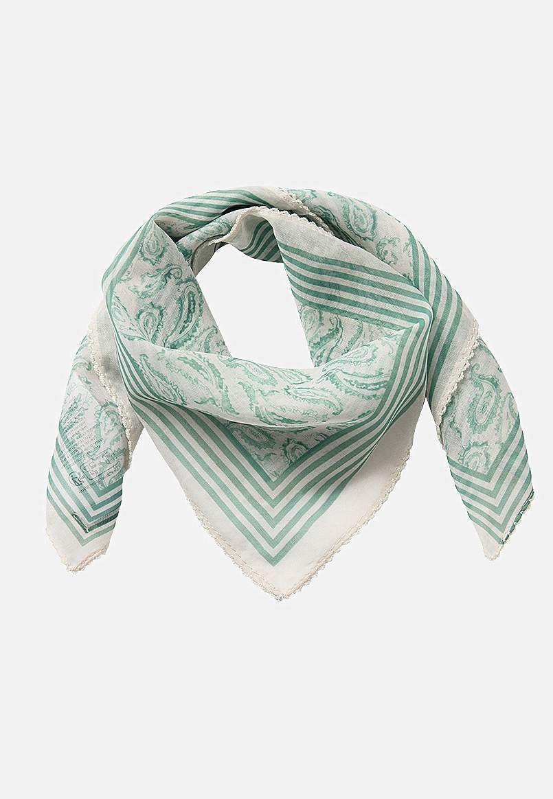 Sjal med paisleymønster og tynne striper. Skirt materiale i polyester. Heklet, dekorativ, bølget kant.