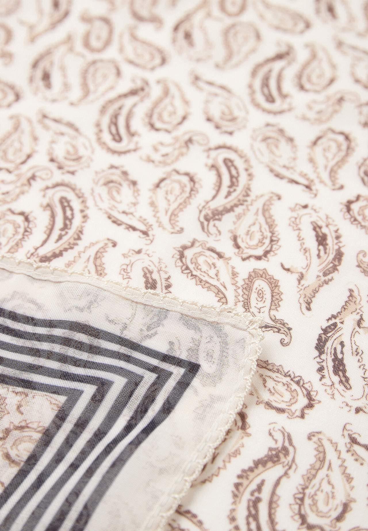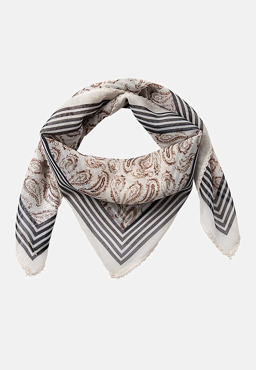 Sjal med paisleymønster og tynne striper. Skirt materiale i polyester. Heklet, dekorativ, bølget kant.