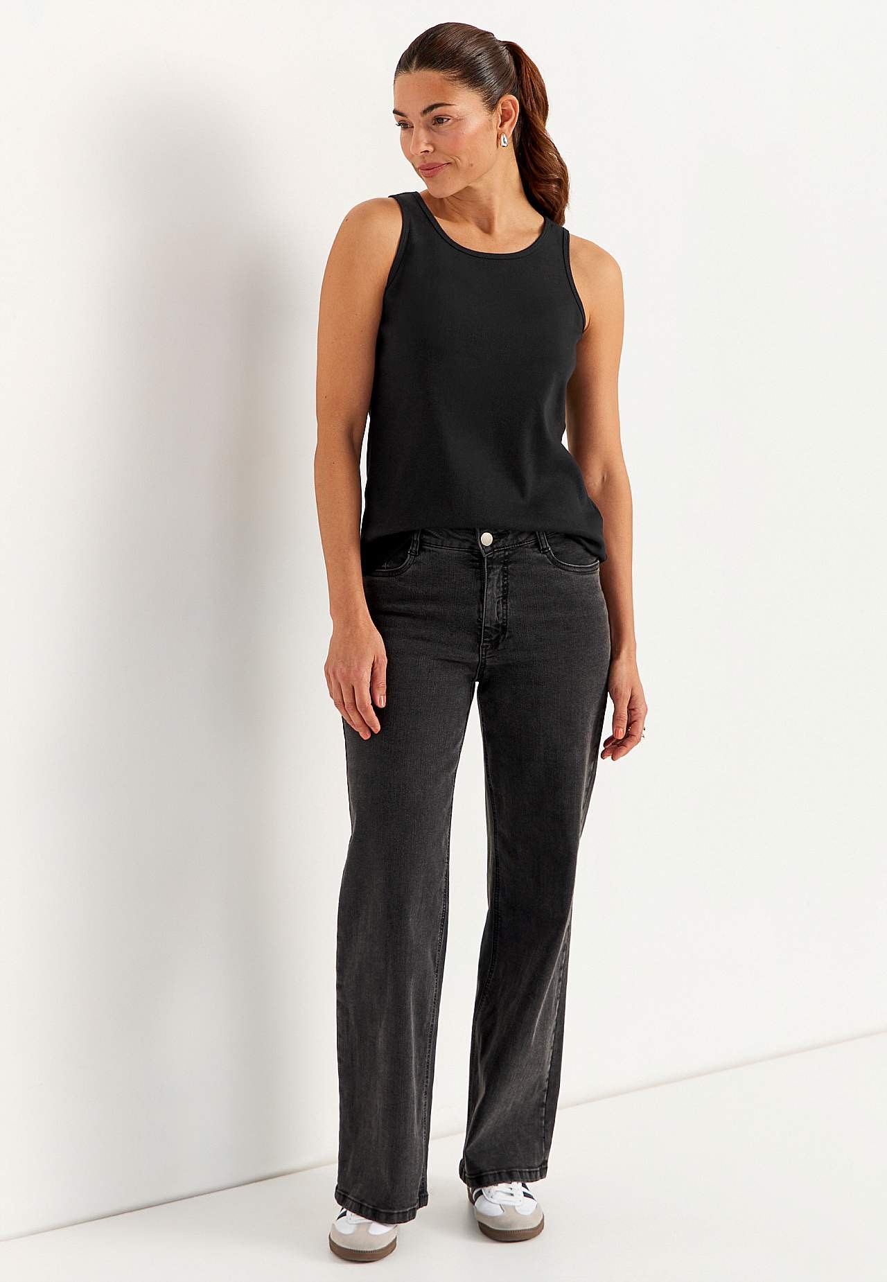 Ribbet singlet med rund hals for basegarderoben din. Stretchy, komfortabel jersey. Normal passform. Økologisk bomull. Avrundet hals med kantbånd. Kantbånd i ermehullet. Rett fald. Lengden følger størrelsen, ca. 58-74 cm fra skulderen.