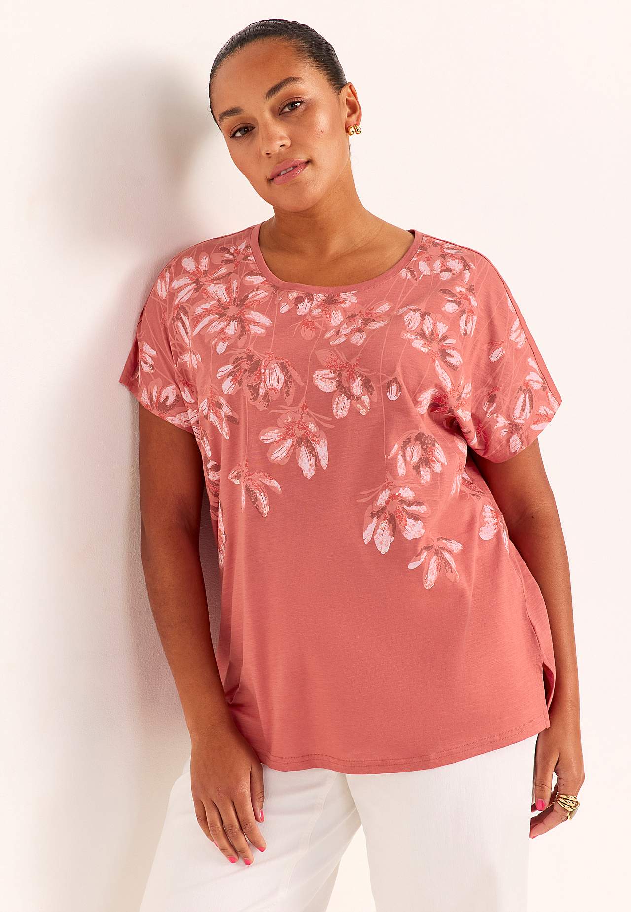 Topp i vidunderlig myk bomull. Rett passform. Korte ermer. Rett fald med splitt i sidene. Lengden følger størrelsen, ca. 67-81 cm fra skulderen.