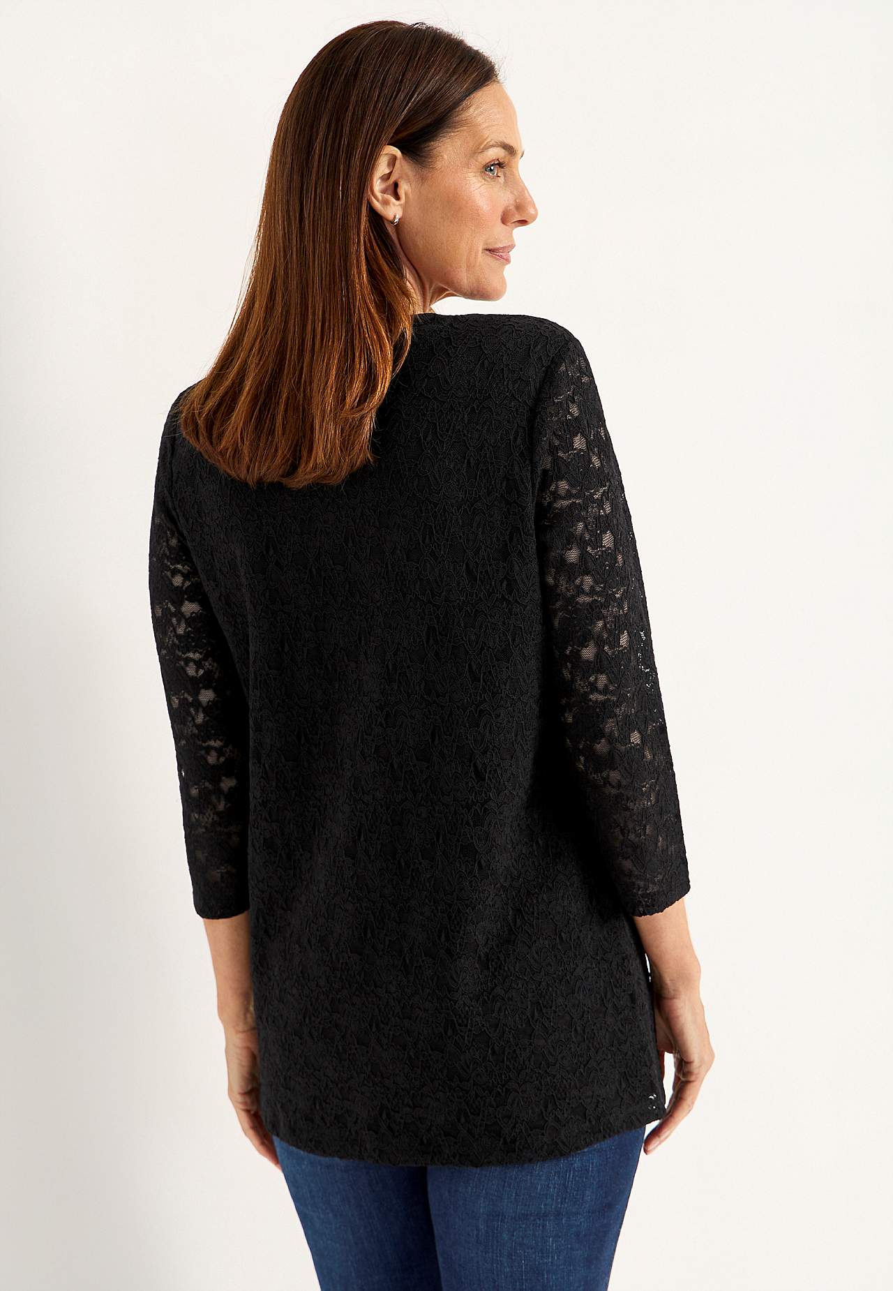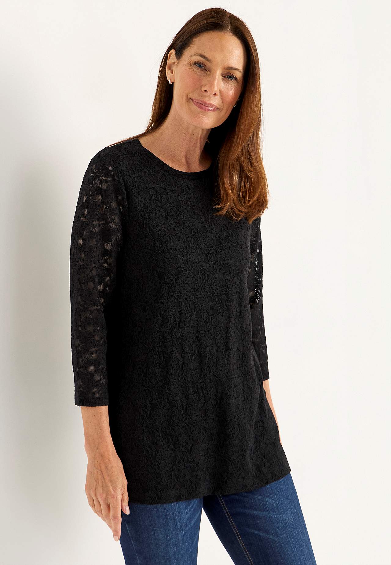 Vakker tunika i stretchy kvalitet. Rett modell. Rundhalset. Myk, jevn fôring i jersey. Ufôret trekvarterme. Rett fald. Lengden følger størrelsen, ca. 72-86 cm fra skulderen.
