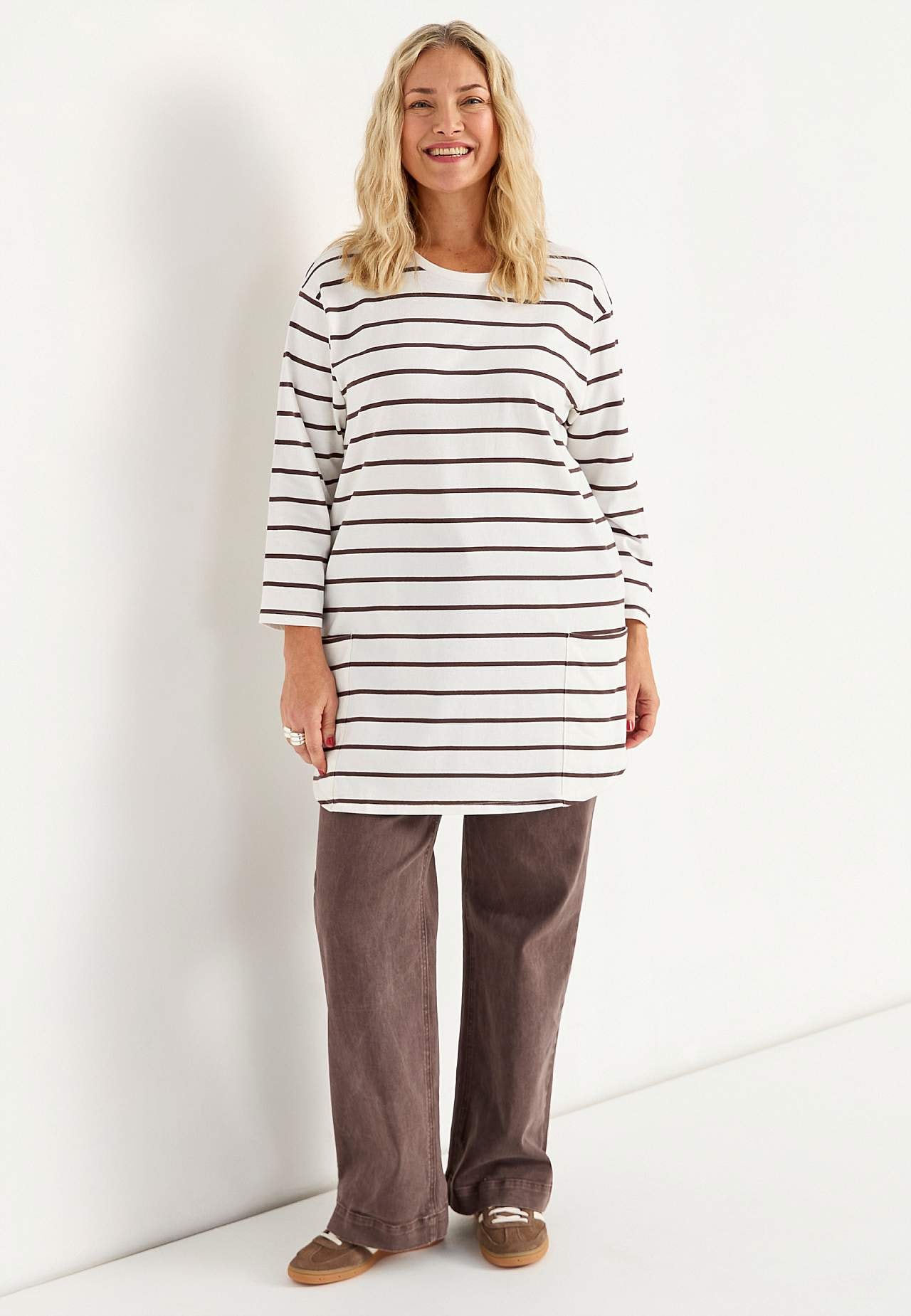 Tunikatopp med komfortable, store lommer. Myk, fast, noe kraftigere kvalitet. Oversized passform. Rund, ribbet hals. Droppet skulder. 3/4-lange, litt videre ermer. Store påsydde frontlommer. Avrundet fald. Lengden følger størrelsen, ca. 78-92 cm fra skulderen.