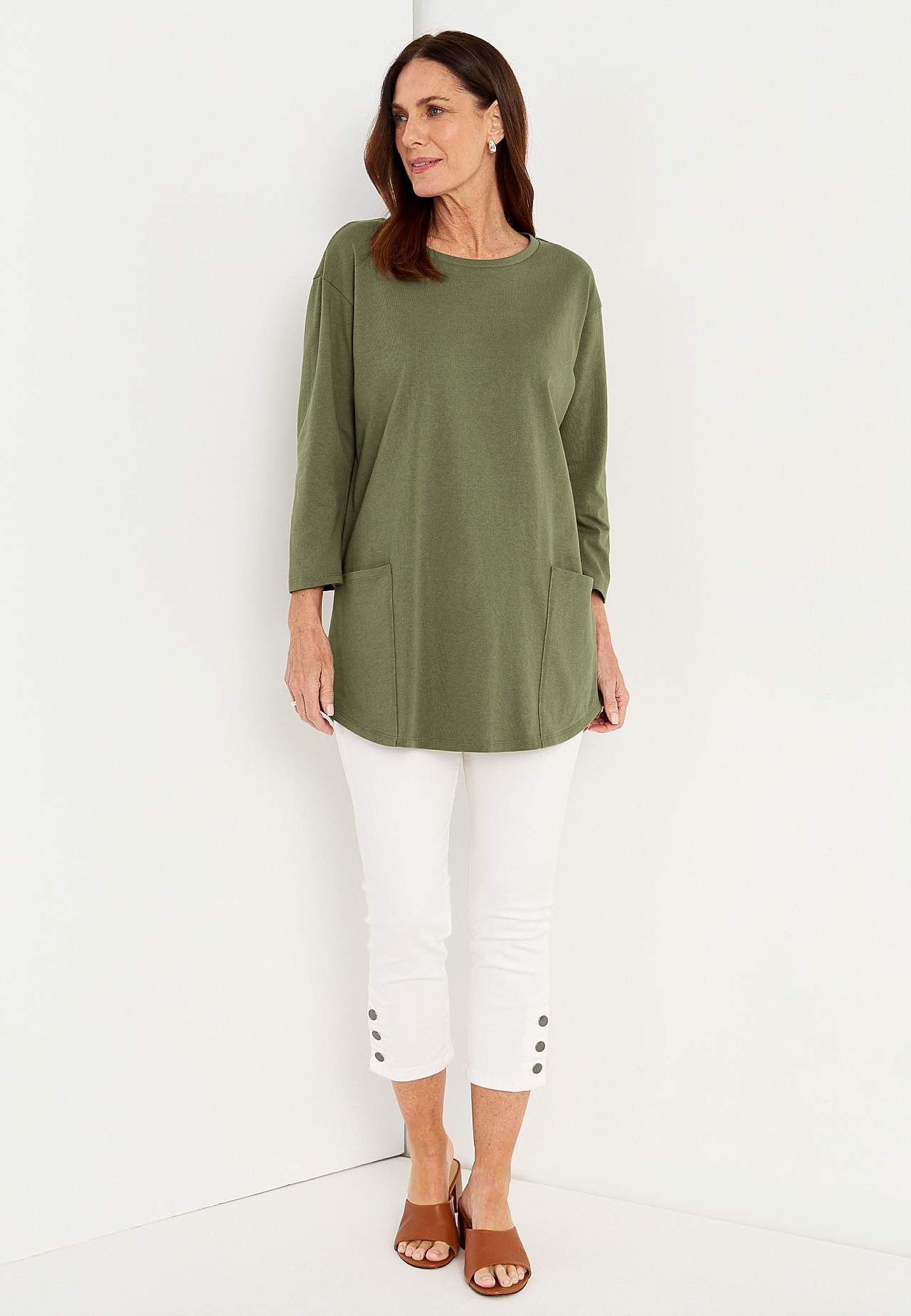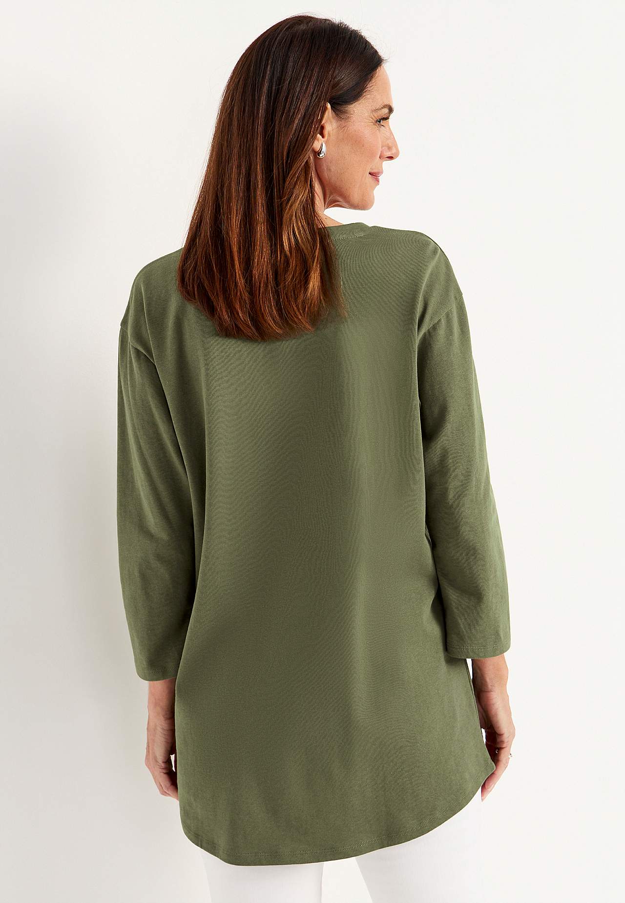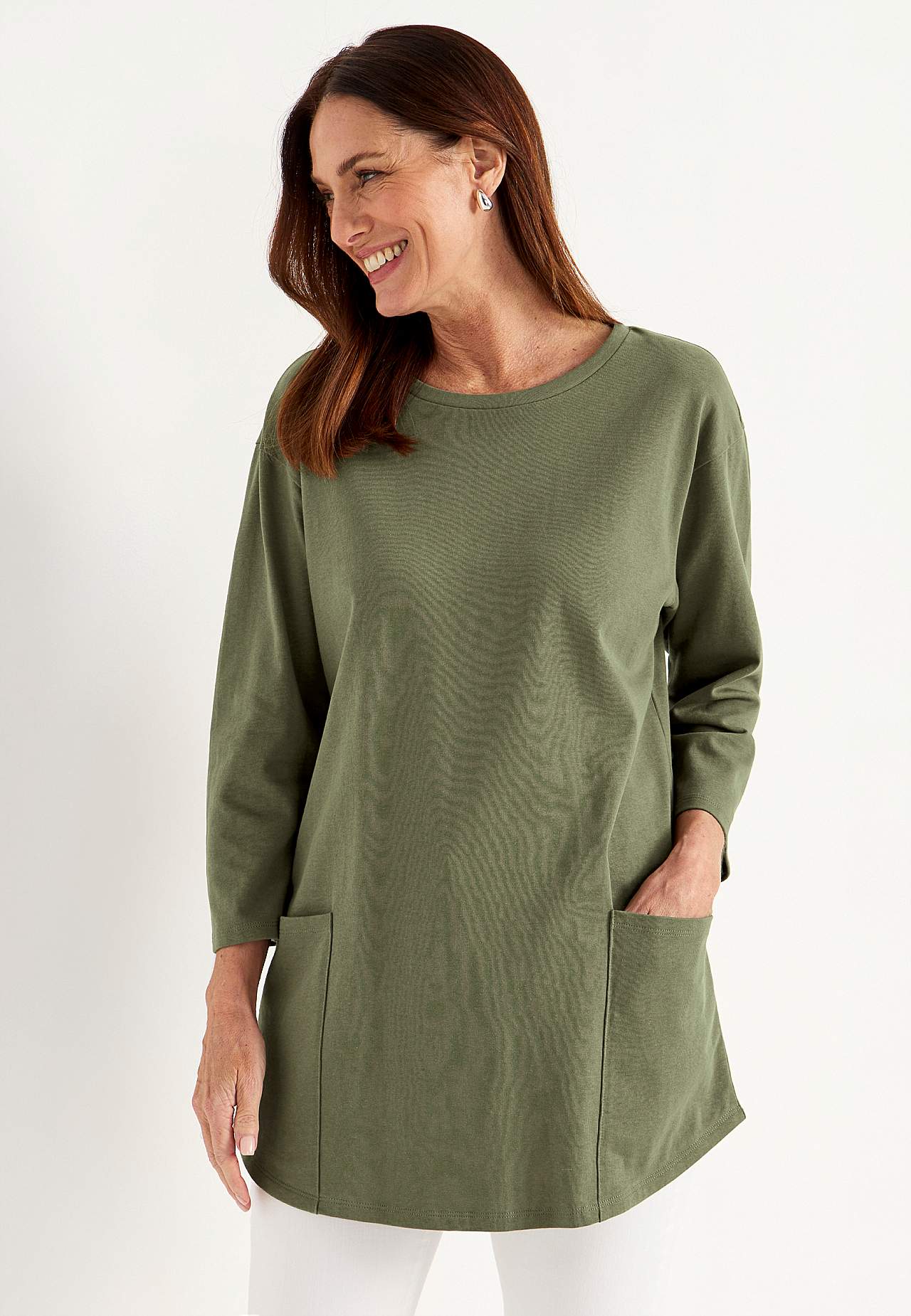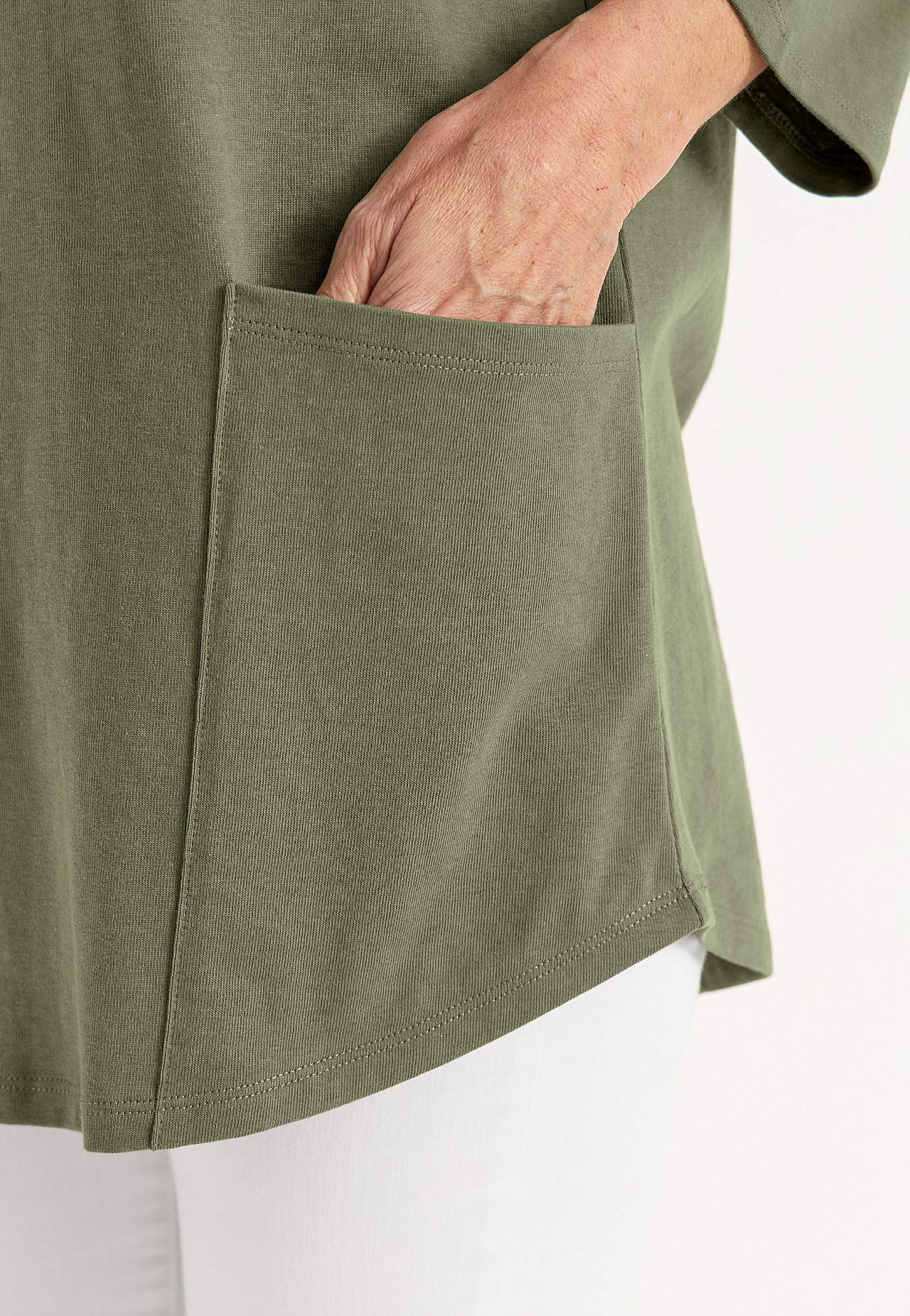 Tunikatopp med komfortable, store lommer. Myk, fast, noe kraftigere kvalitet. Oversized passform. Rund, ribbet hals. Droppet skulder. 3/4-lange, litt videre ermer. Store påsydde frontlommer. Avrundet fald. Lengden følger størrelsen, ca. 78-92 cm fra skulderen.