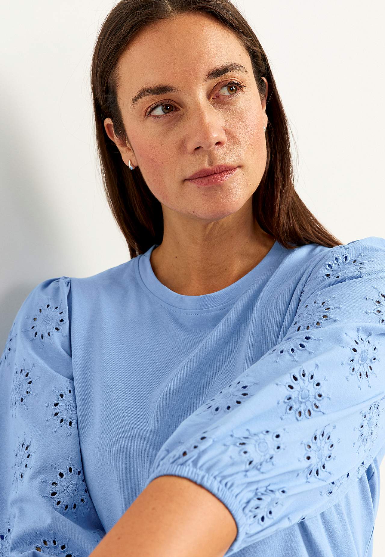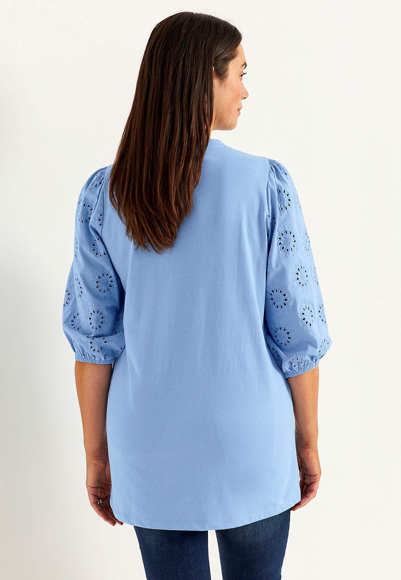 Tunika i noe kraftigere, fast bomullsmiks. Normal passform. Effektfull rynke på skuldrene. Avrundet hals. Vide, 3/4-lange ermer med hullmønster med engelsk broderi og strikk i ermeslutten. Rett fald. Rygglengden følger størrelsen, ca. 78-86 cm.