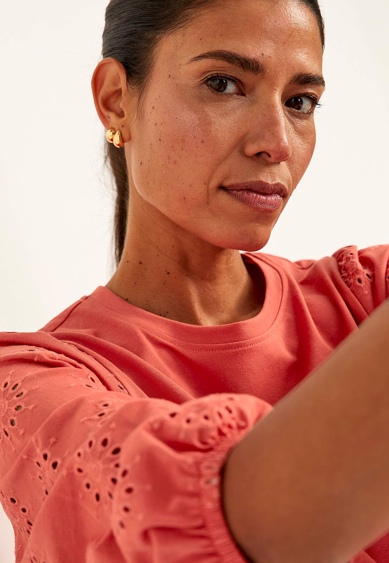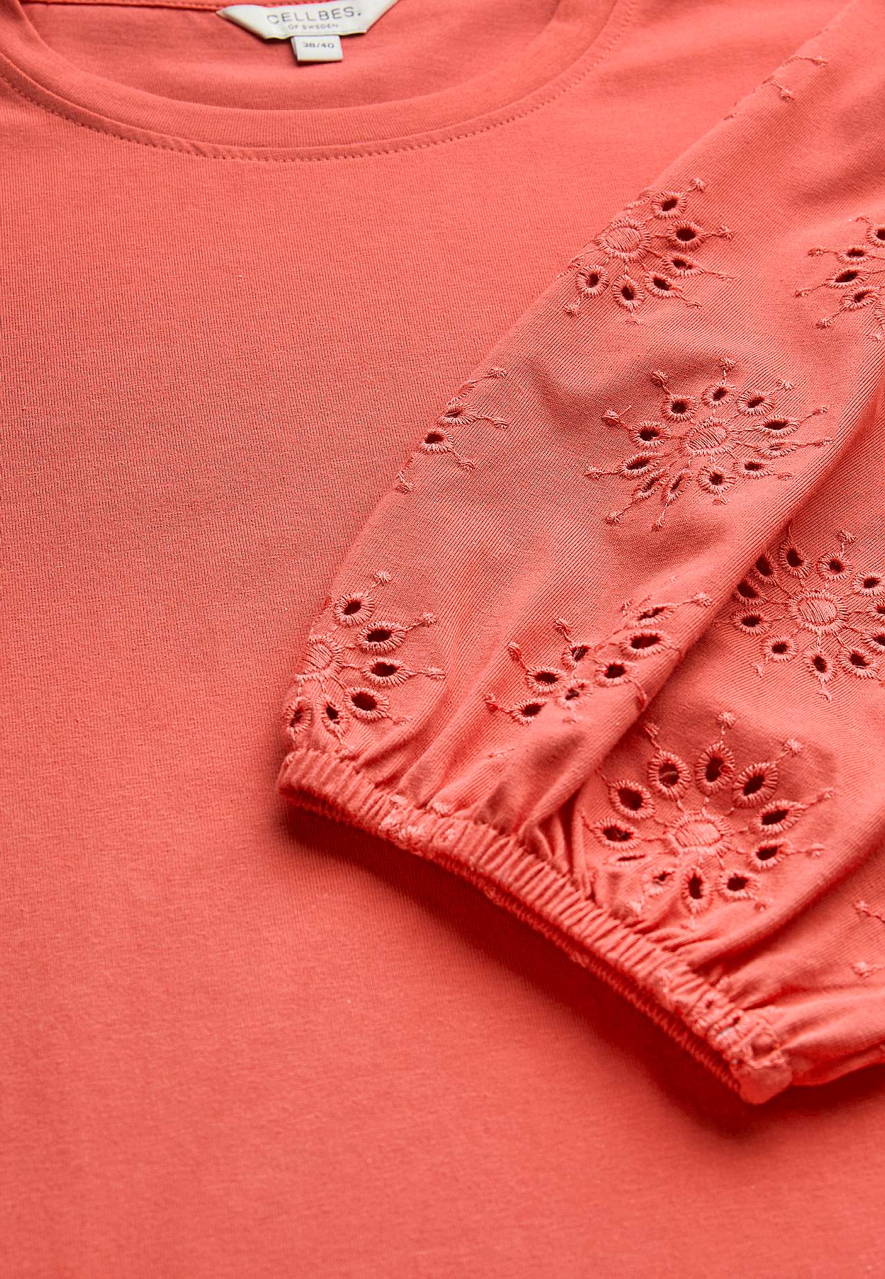 Tunika i noe kraftigere, fast bomullsmiks. Normal passform. Effektfull rynke på skuldrene. Avrundet hals. Vide, 3/4-lange ermer med hullmønster med engelsk broderi og strikk i ermeslutten. Rett fald. Rygglengden følger størrelsen, ca. 78-86 cm.