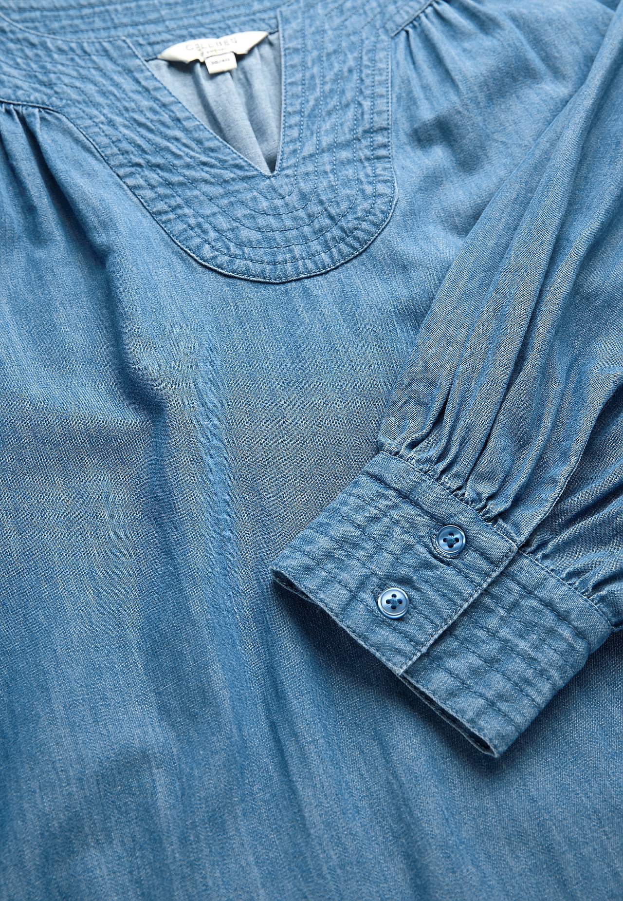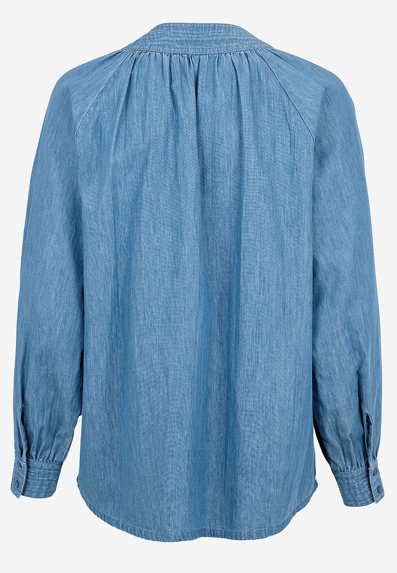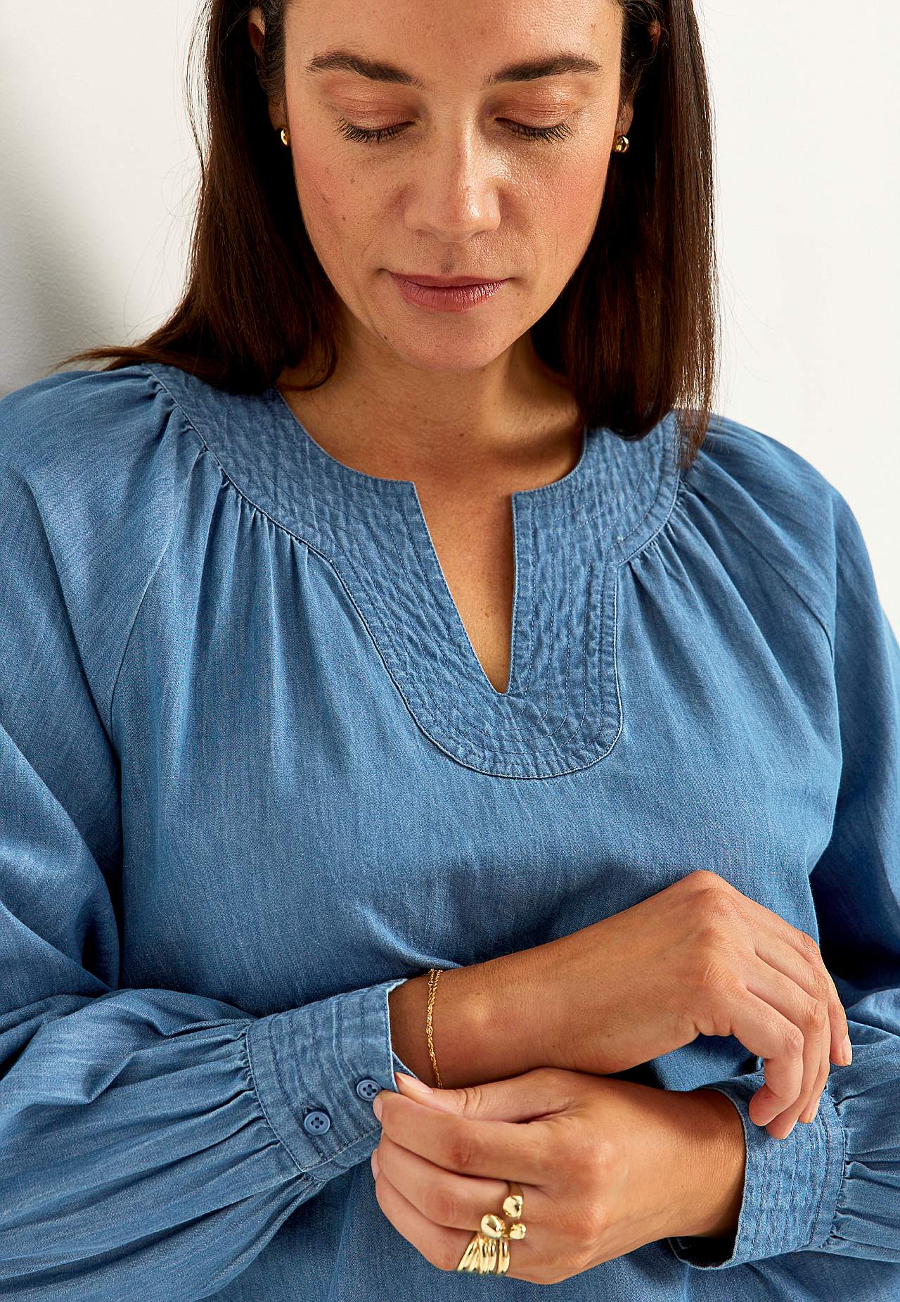Tunika i lite lättare, härligt mjuk denimkvalitet. Naturligt fall med luftig känsla. Lös, lätt a-linjeformad passform. Rund hals med v-skärning och dekorativa sömmar runt om. Långa, vida raglanärmar med manschett i ärmsluten med dekorsömmar och två knappar. Rundad nederkant något längre baktill. Rygglängden följer storleken... Les mer