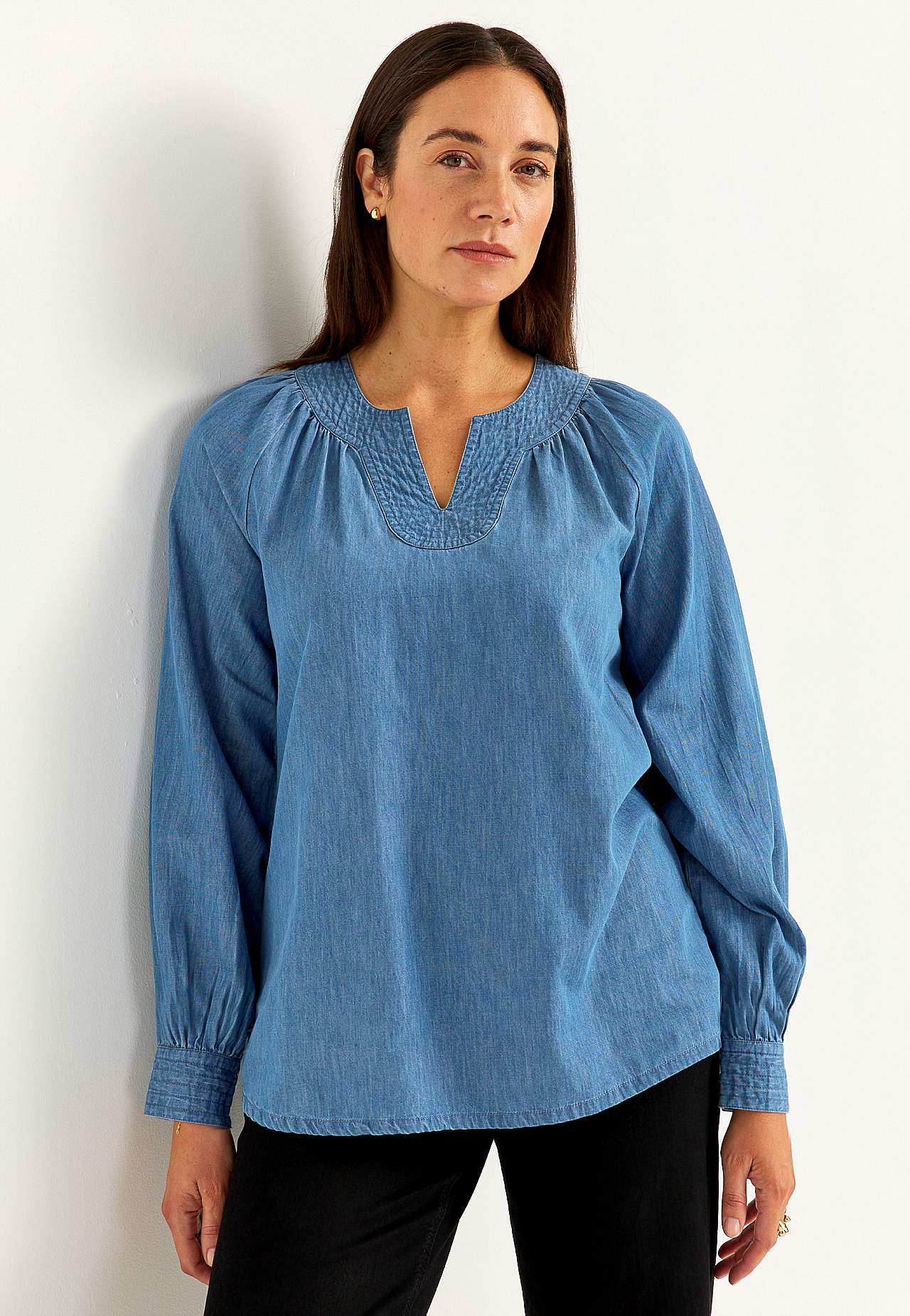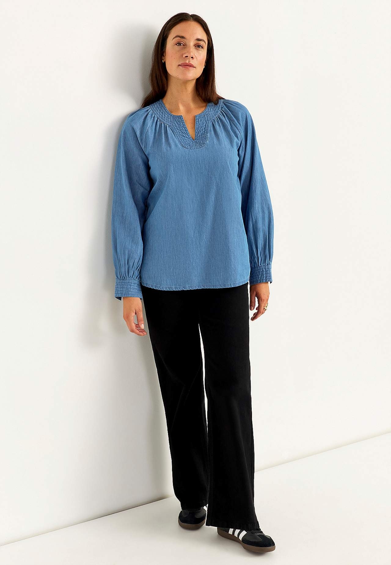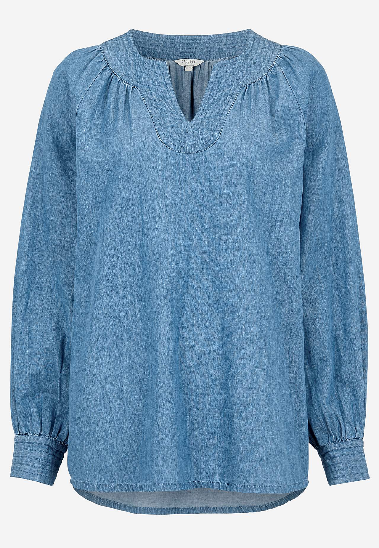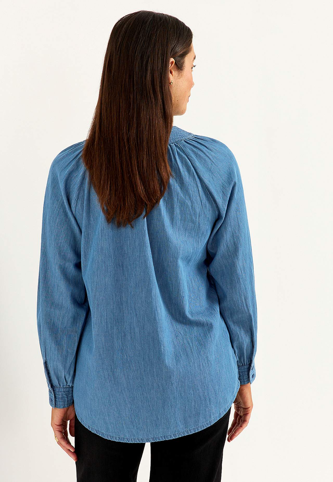 Tunika i lite lättare, härligt mjuk denimkvalitet. Naturligt fall med luftig känsla. Lös, lätt a-linjeformad passform. Rund hals med v-skärning och dekorativa sömmar runt om. Långa, vida raglanärmar med manschett i ärmsluten med dekorsömmar och två knappar. Rundad nederkant något längre baktill. Rygglängden följer storleken... Les mer