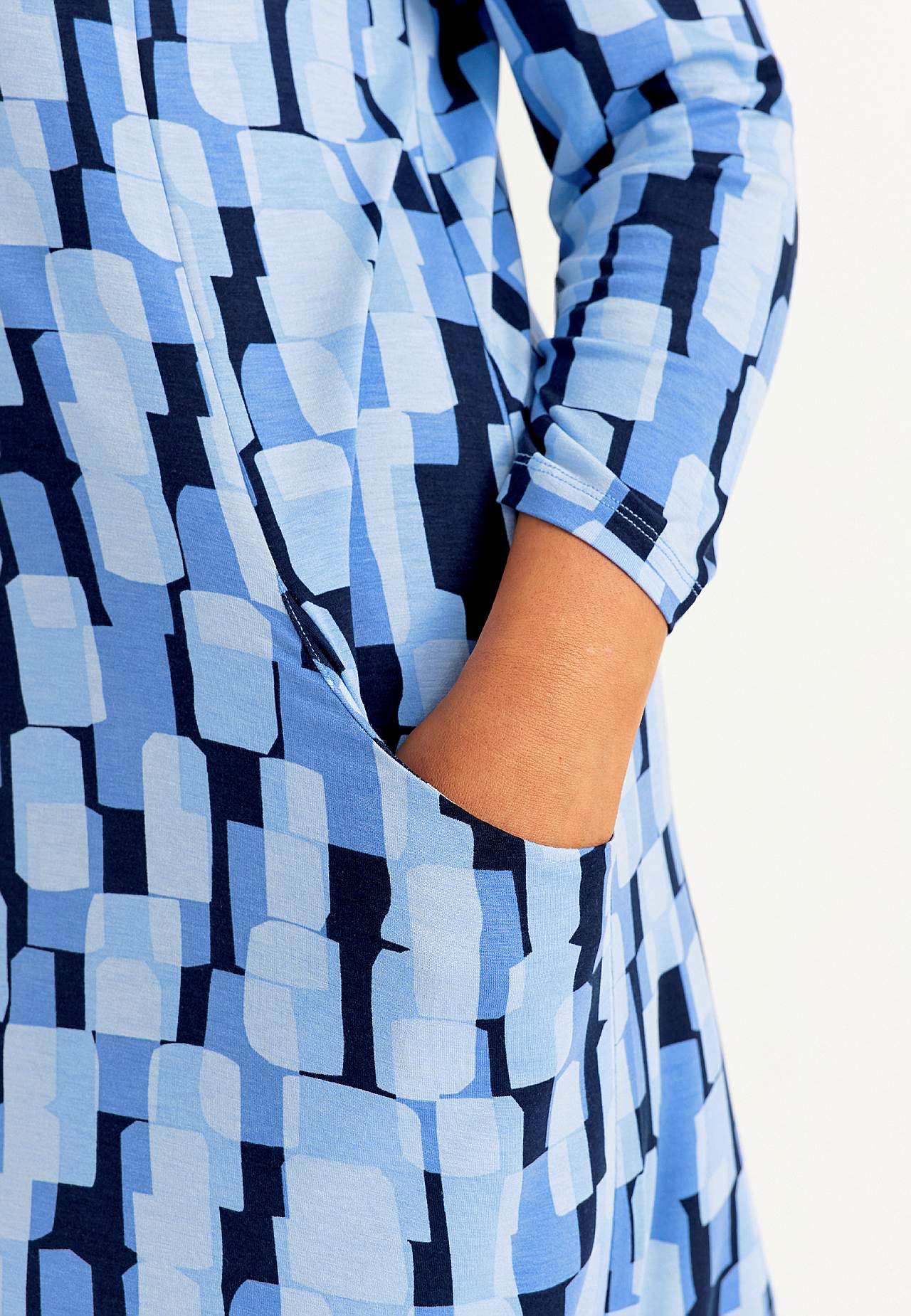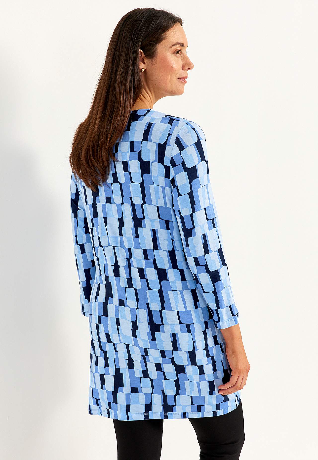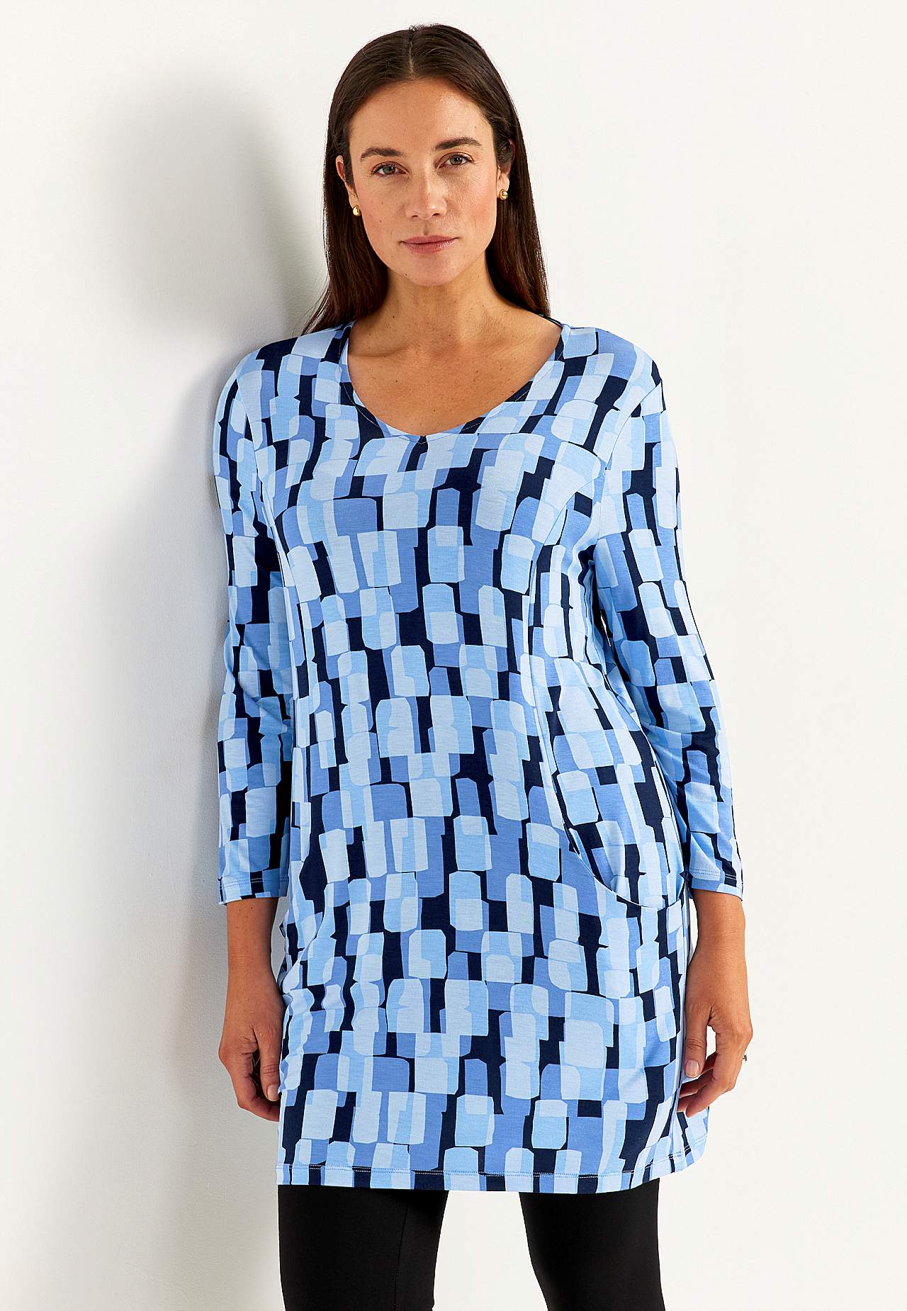 Tunika i nydelig myk, elastisk viskose. Kjølende materiale med fint fall. Normal passform. V-formet hals. Panelsømmer foran. Lommer foran. Rette 3/4 ermer. Rett fald. Lengden følger størrelsen, ca. 82-89 cm fra skulderen.