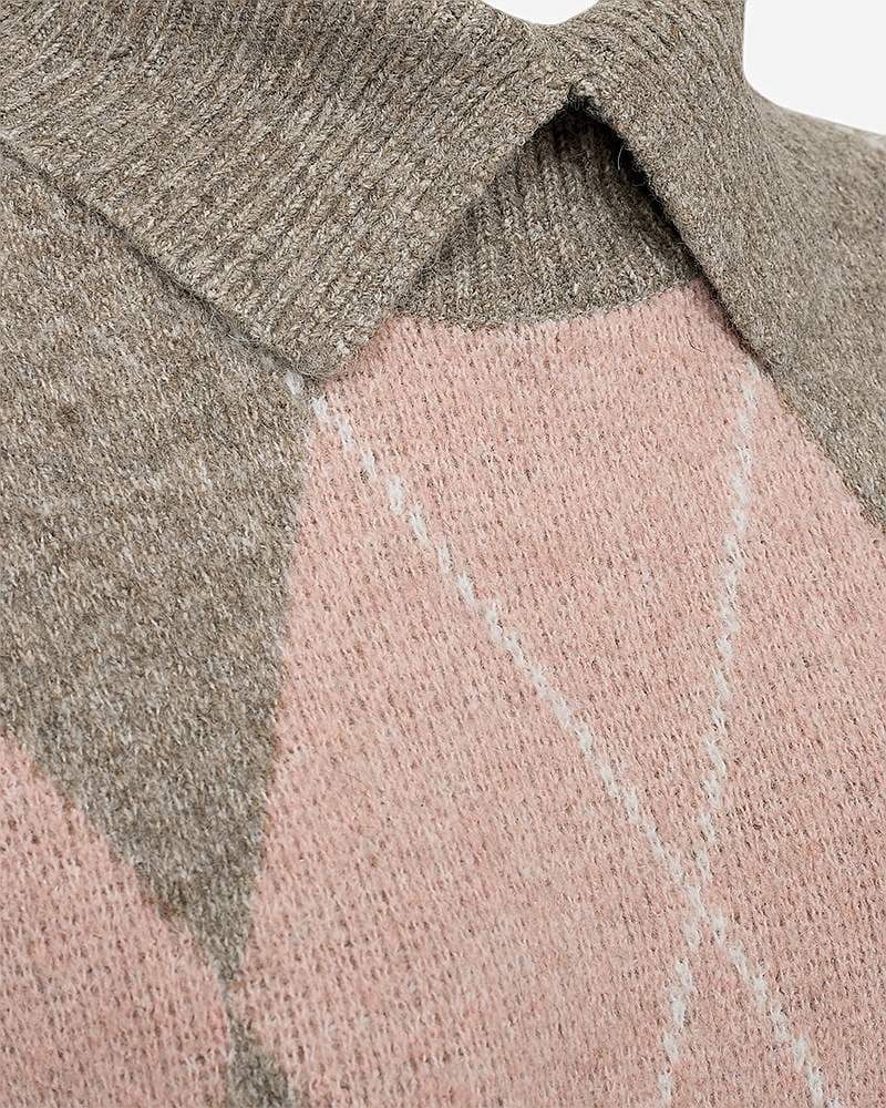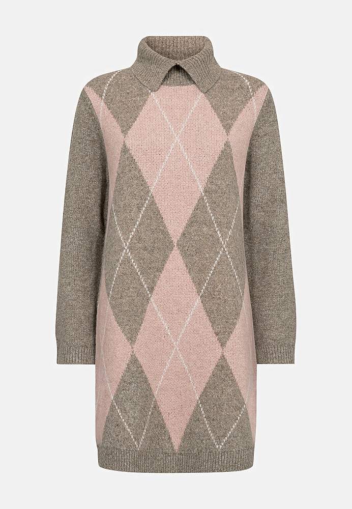 Myk, strikket tunika. Rett, litt løsere passform. Diagonal rutemønster på forsiden med rosa, beige farger. Polokrage med splitt foran. Lange ermer med ribbet mansjett og skjær i ermeslutten. Rett fald med ribbet mansjett. Lengde fra skulder ca. 90 cm i størrelse S (38).