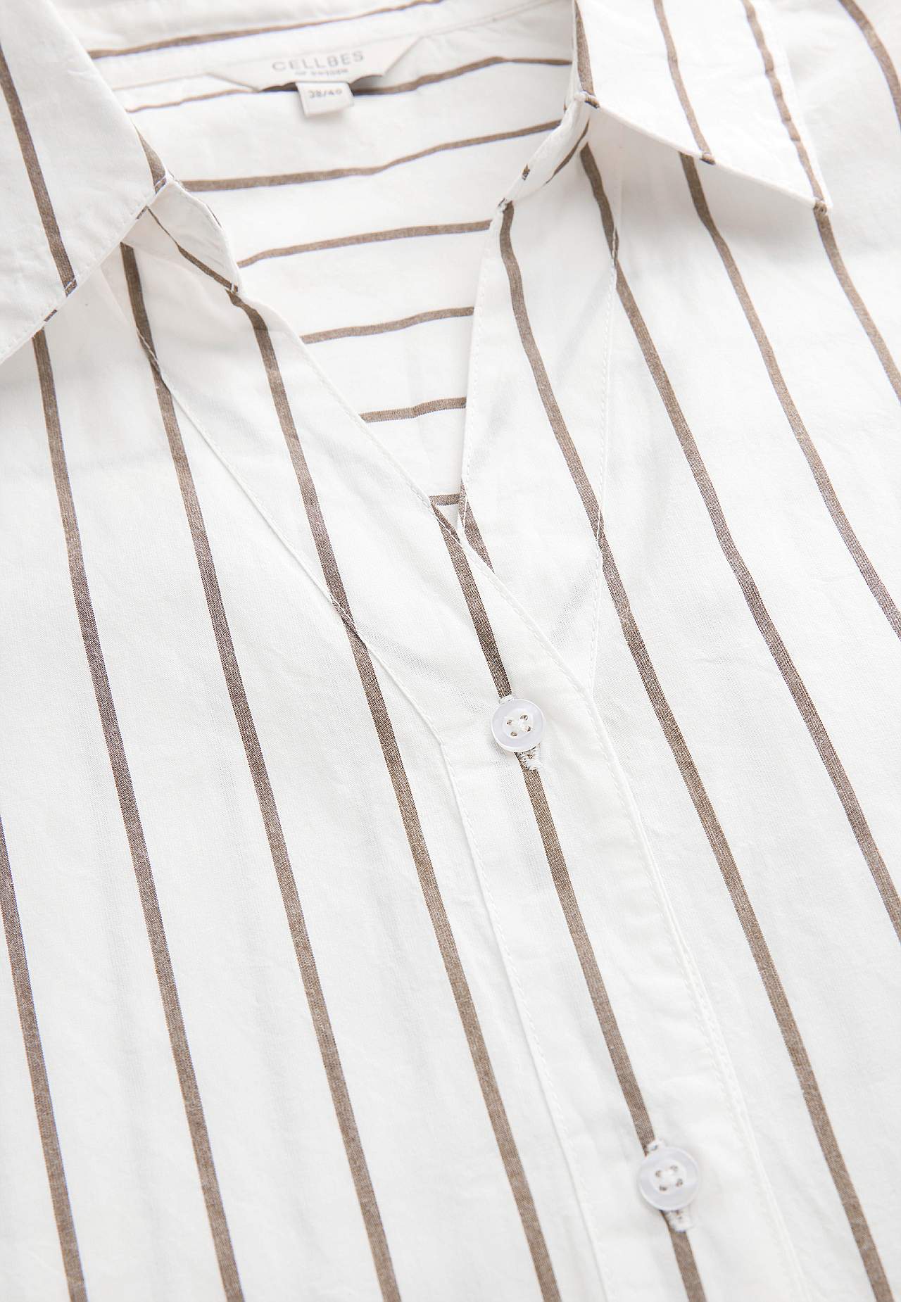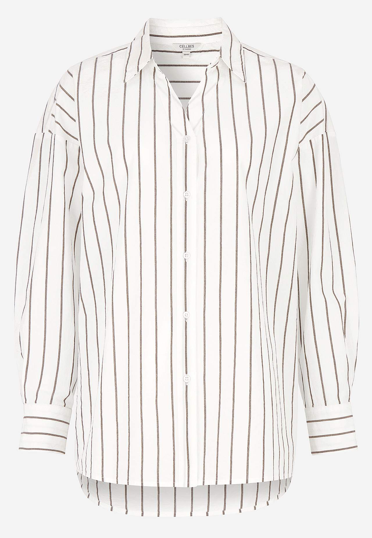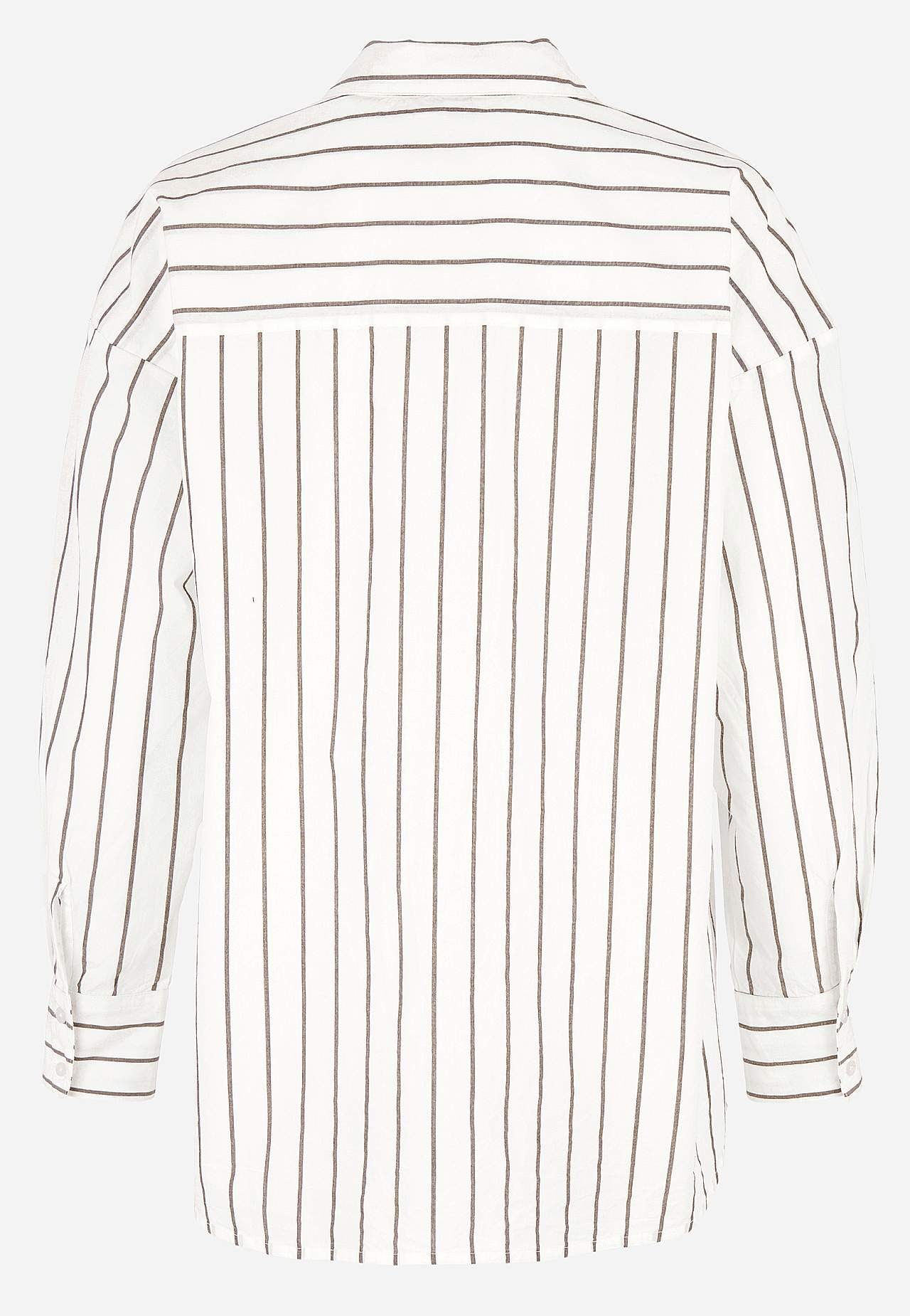 Lengre skjorte med klassisk krage og garnfarget, elegant stripe. Vevet, mykt materiale med polert følelse. Løstsittende og ledig passform. Klassisk krage og kledelig v-hals. Droppet skulder. Gjennomkneppet modell. Bærestykke på baksiden. Lange ermer med mansjett og knapper. Avrundet, litt lengre bak fald. Lengden følger st... Les mer