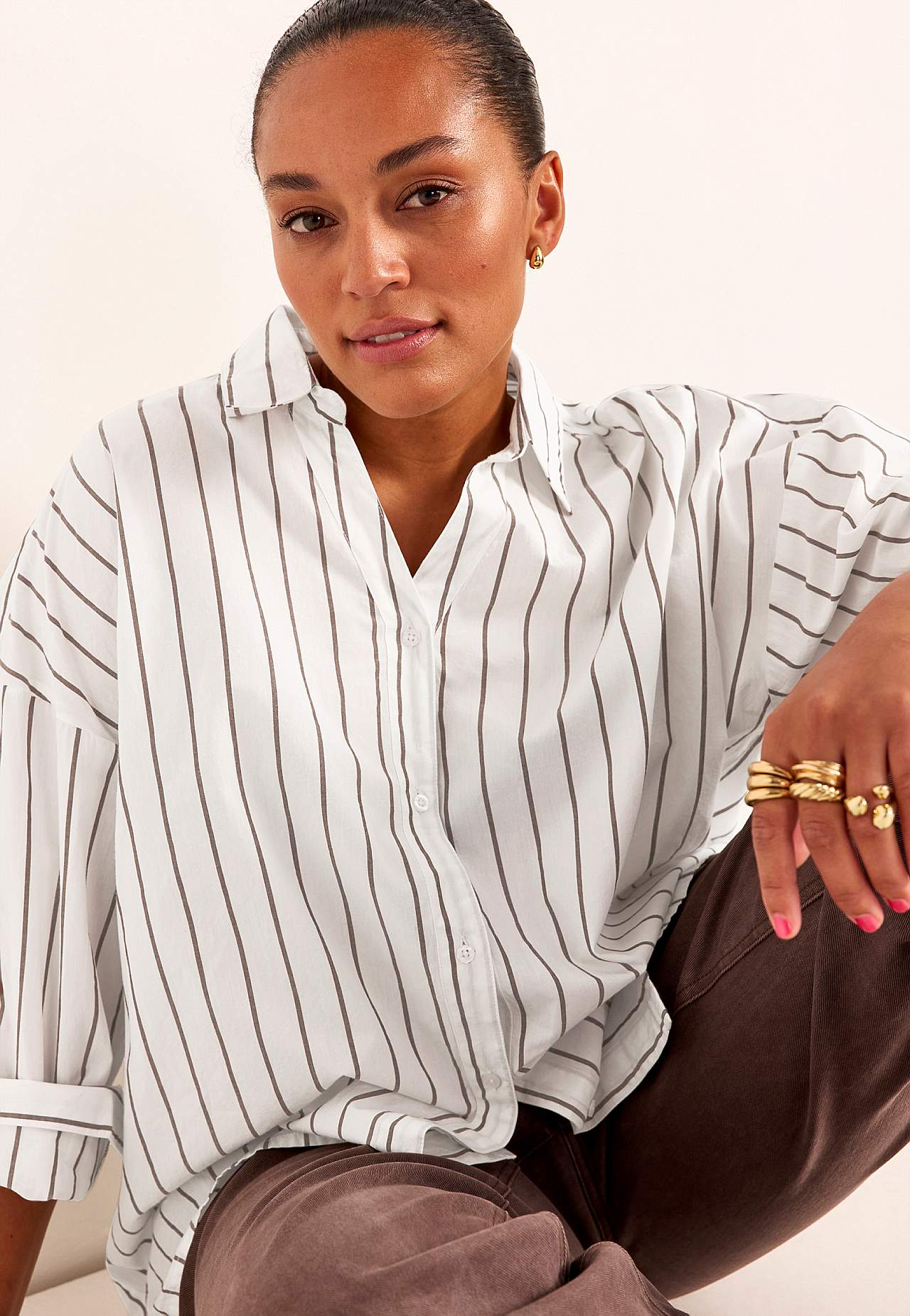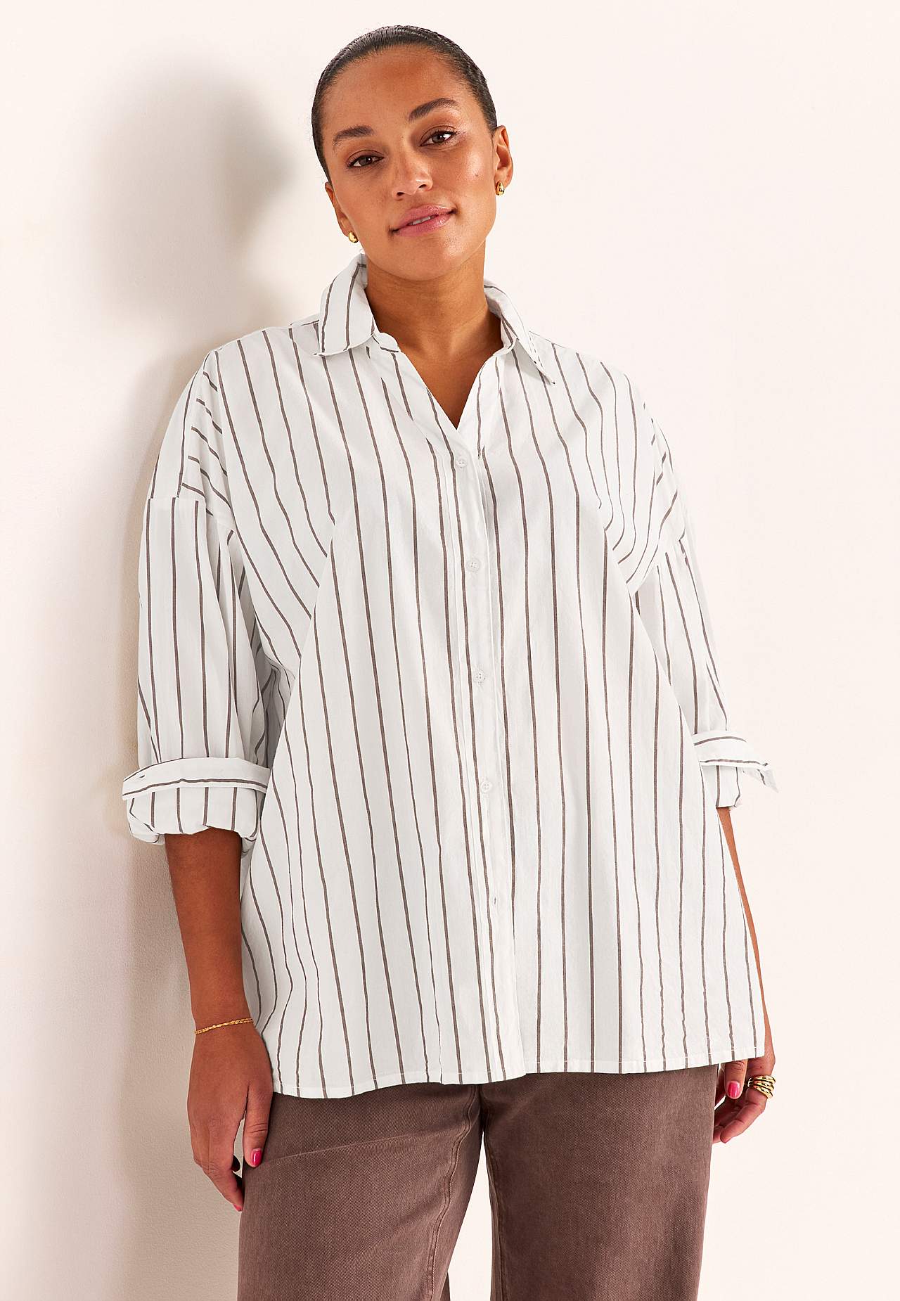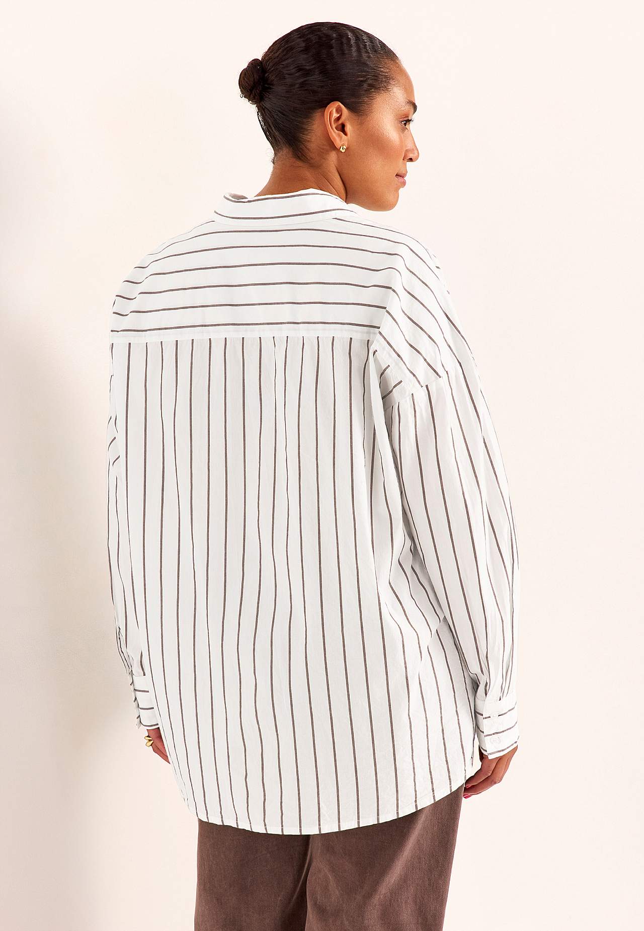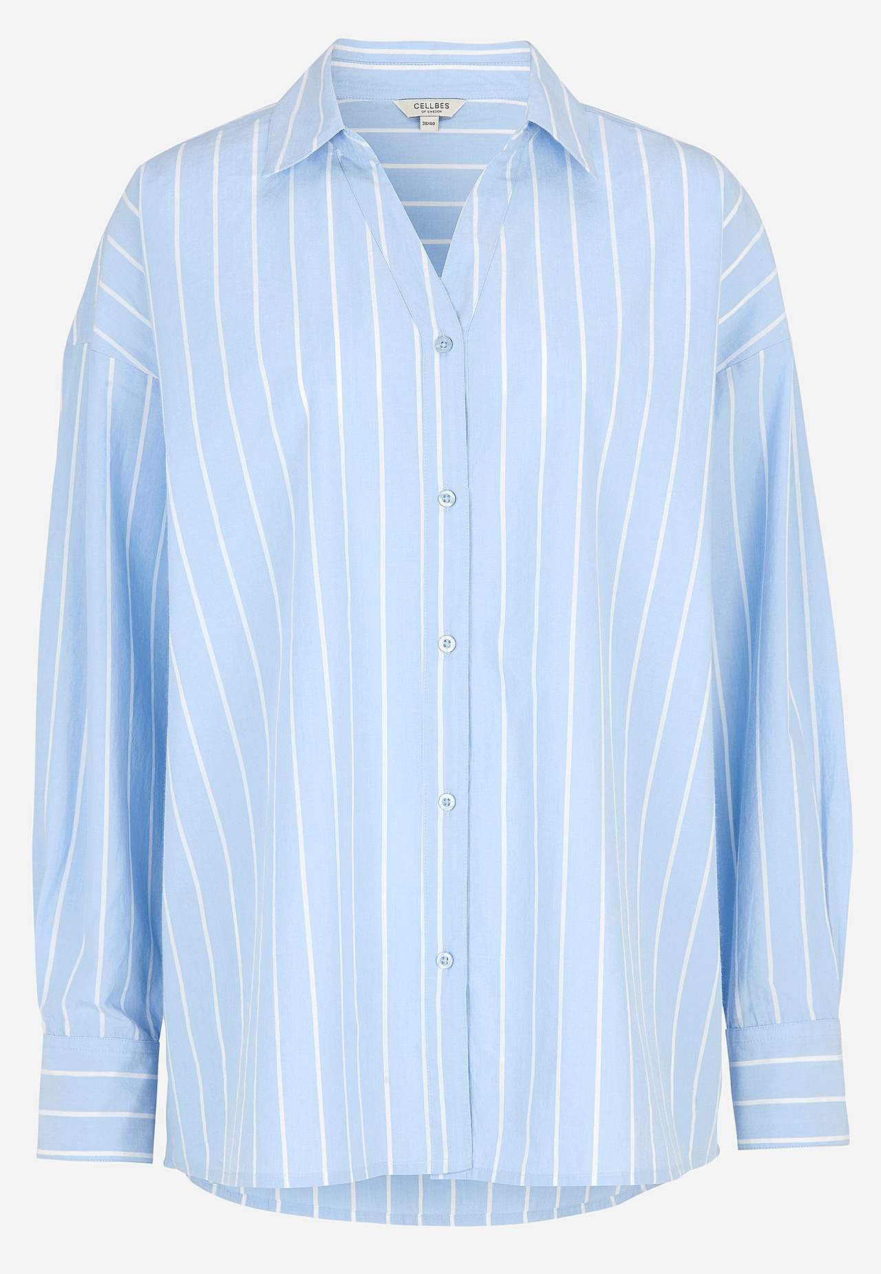 Lengre skjorte med klassisk krage og garnfarget, elegant stripe. Vevet, mykt materiale med polert følelse. Løstsittende og ledig passform. Klassisk krage og kledelig v-hals. Droppet skulder. Gjennomkneppet modell. Bærestykke på baksiden. Lange ermer med mansjett og knapper. Avrundet, litt lengre bak fald. Lengden følger st... Les mer