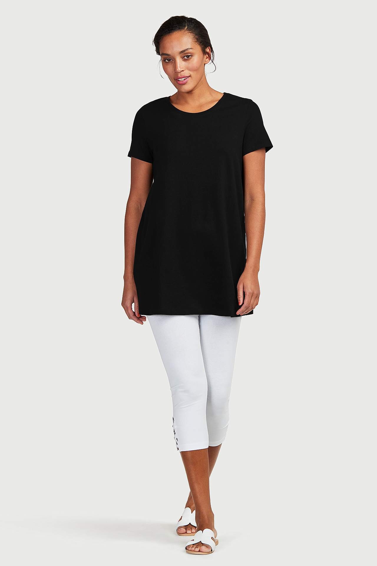 Tunika i ensfarget tricot. A-linjeformet passform med korte ermer. Rund hals. Lengden følger størrelsen, ca. 79-86 cm fra skulderen bak. Korte ermer. Flatterende a-linjeform.