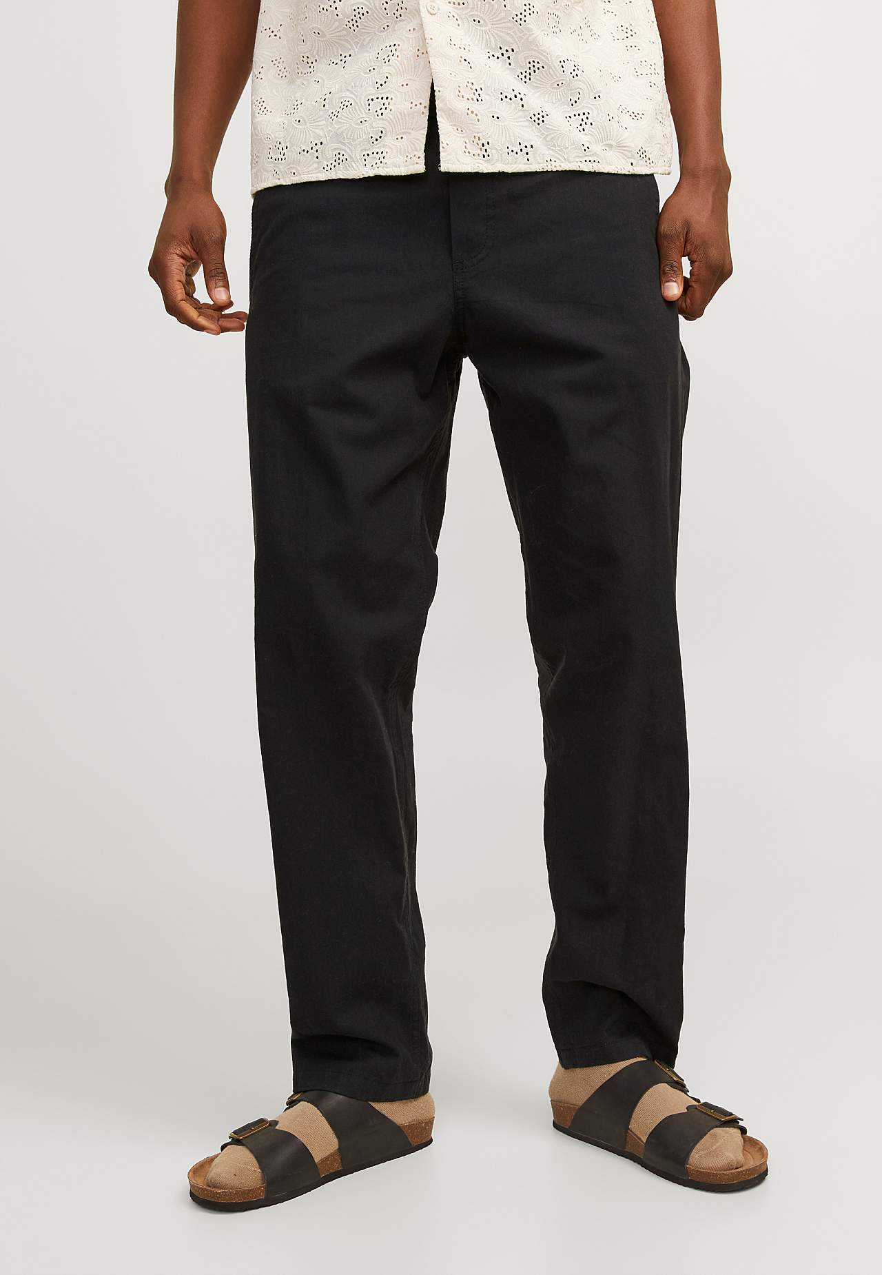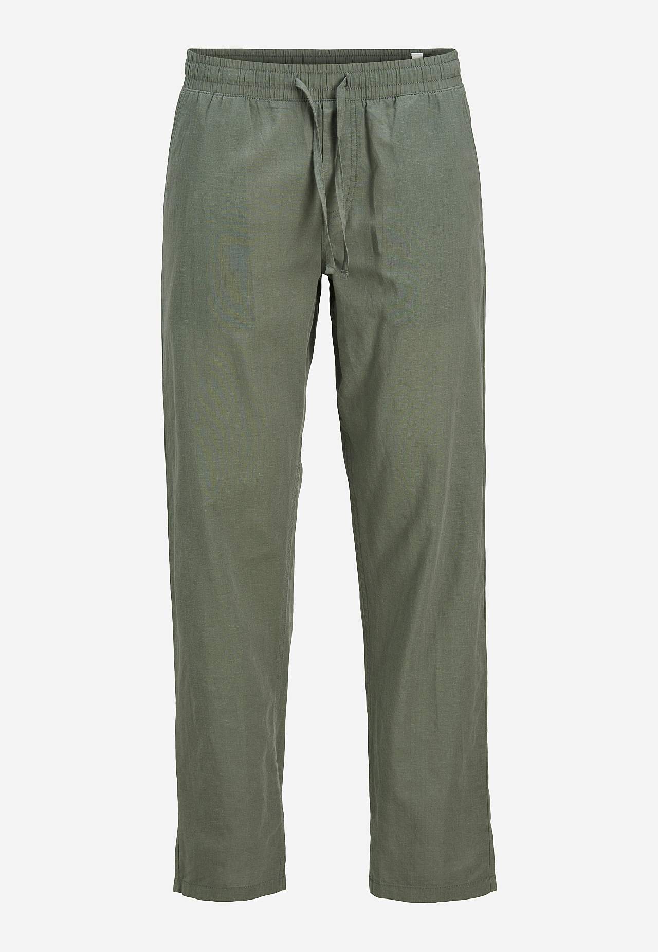 Vevet bukse i kjølende, litt tynnere linblanding. Avslappet passform. Dra på-modell i midjen. Midje med bred strikk og snøring. Skrå frontlommer. En innfelt baklomme. Indre benlengde omtrent 78 cm i størrelse L.