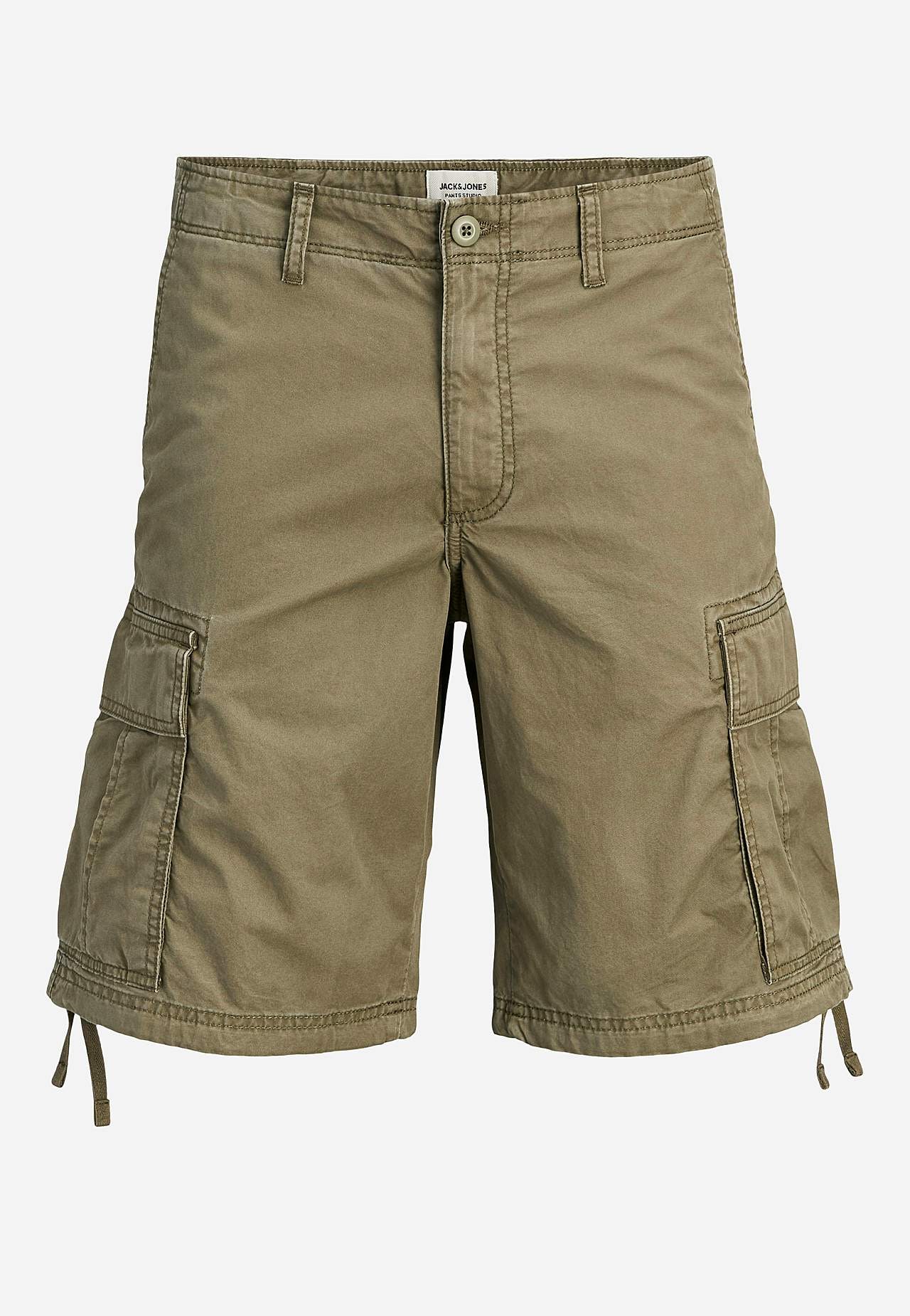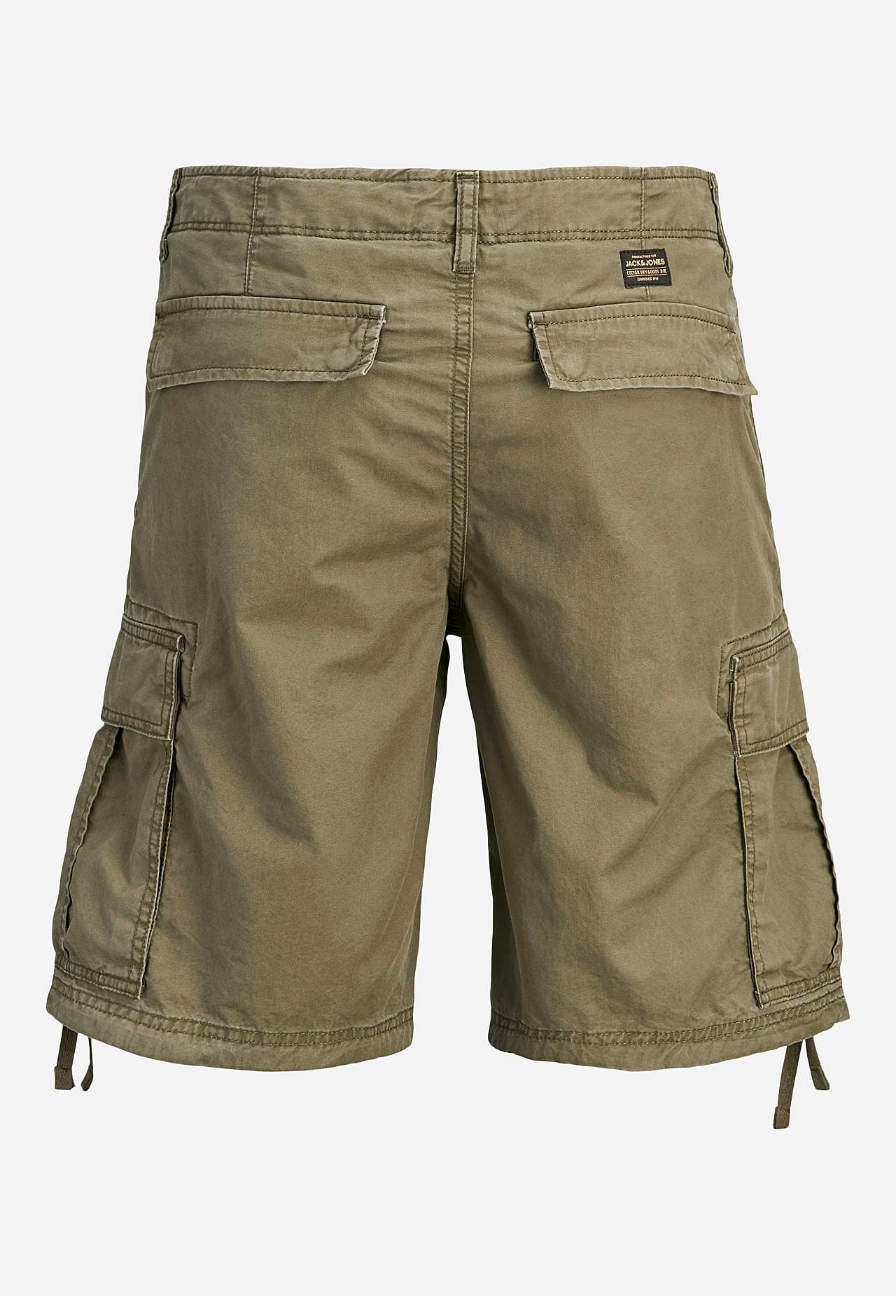 Vevet shorts i bomullskvalitet. Normal midje med lynlås og beltestropper. Sidelommer. Benlommer med klaff. Innfelte baklommer med klaff og trykknapplukning. Knytbar snøre på bunnen. Indre benlengde omtrent 28 cm i størrelse 46.