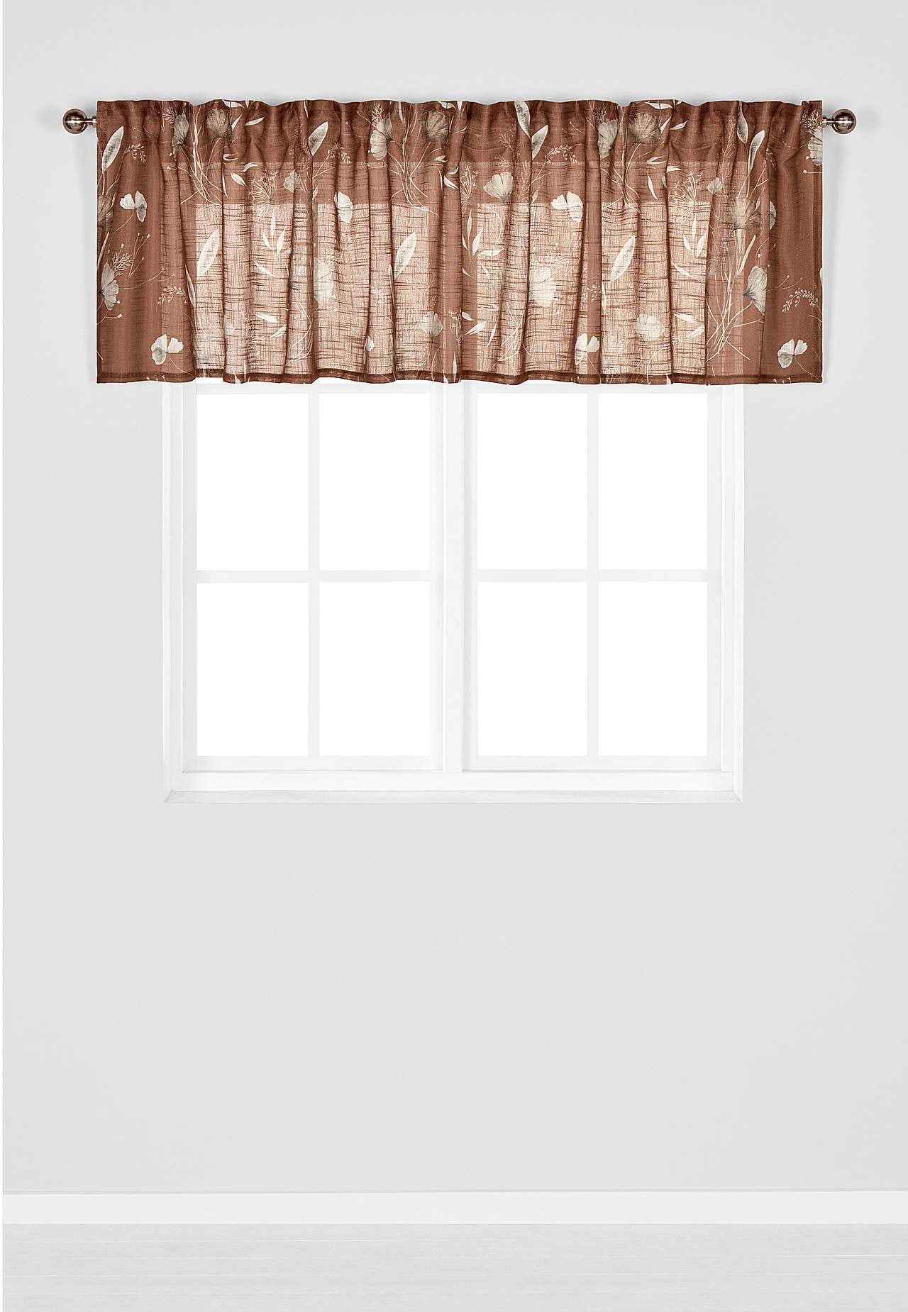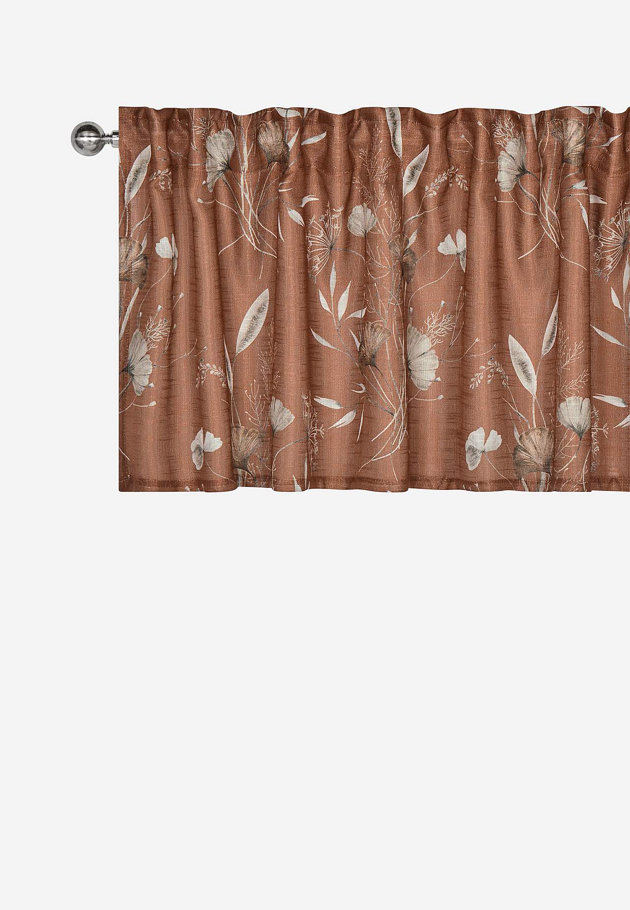 Gardinkappe med digitaltrykt mønster med skire blomster og stilker. Løsvevet stoff med litt kraftigere innvevde slubtråder som gir en fin struktur. Bra lysgjennomslipp. Trykket er ganske synlig på baksiden.