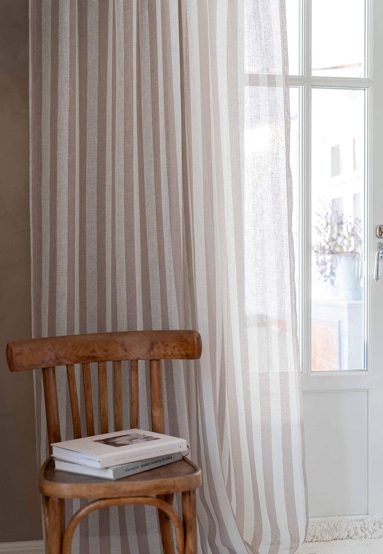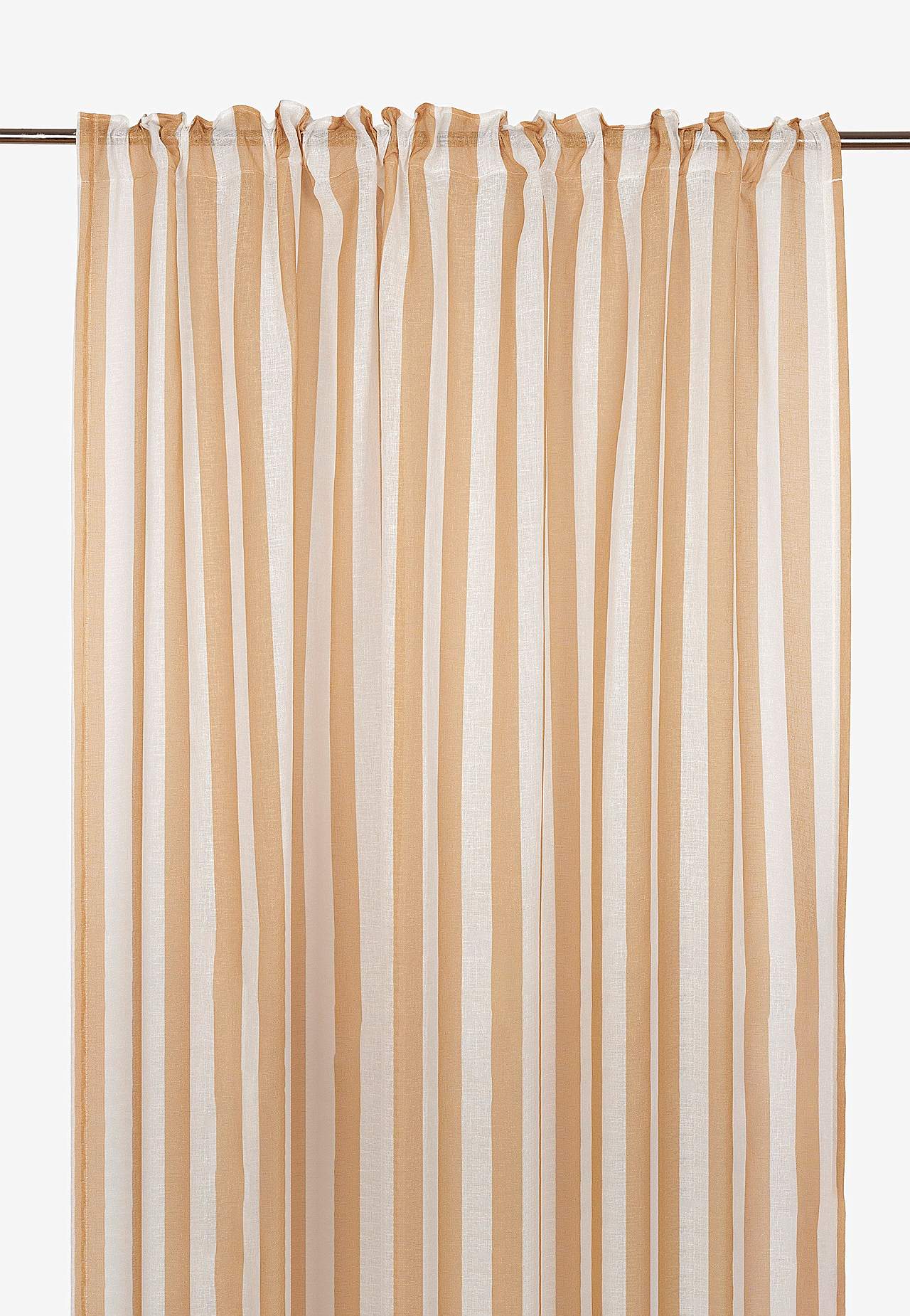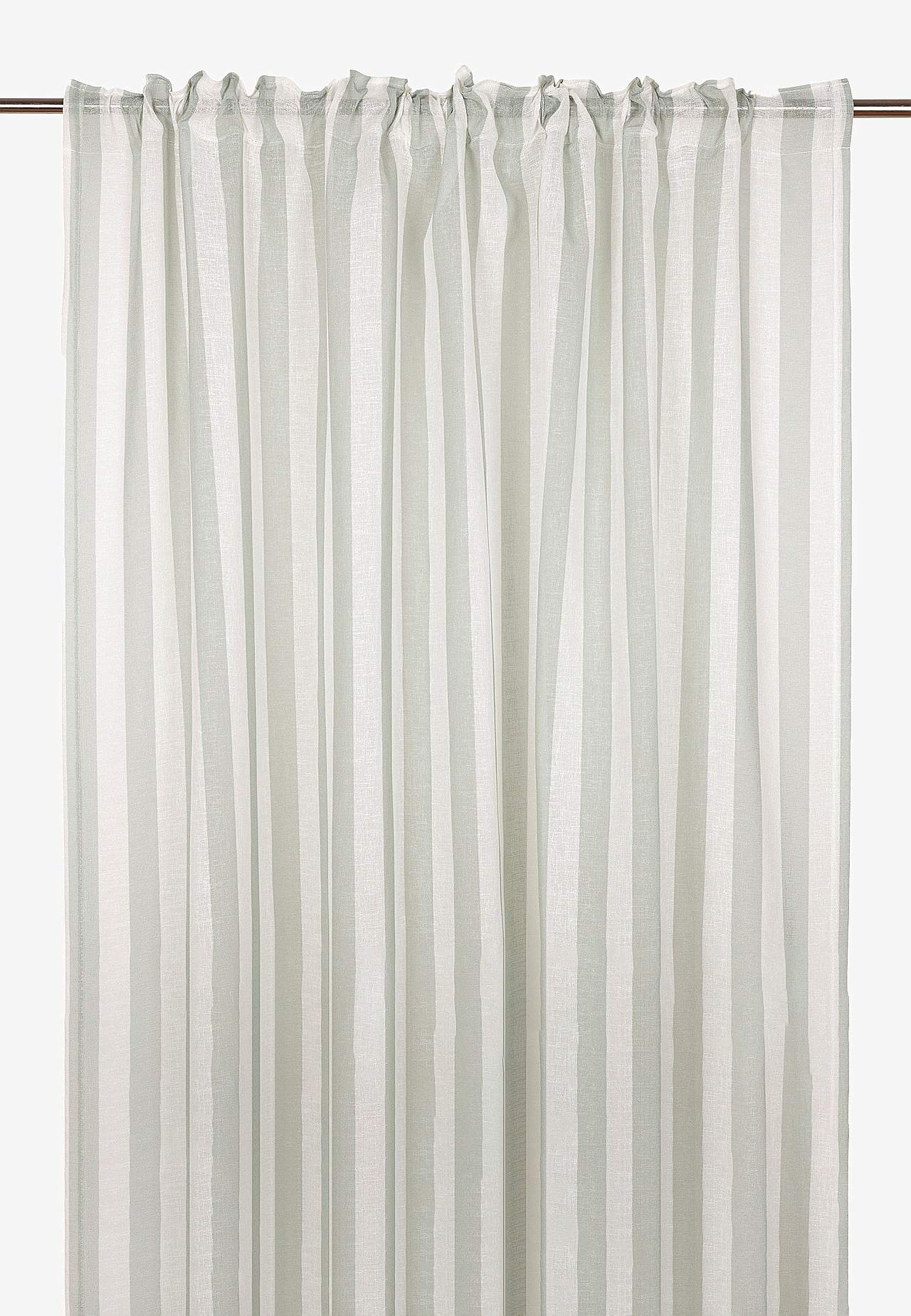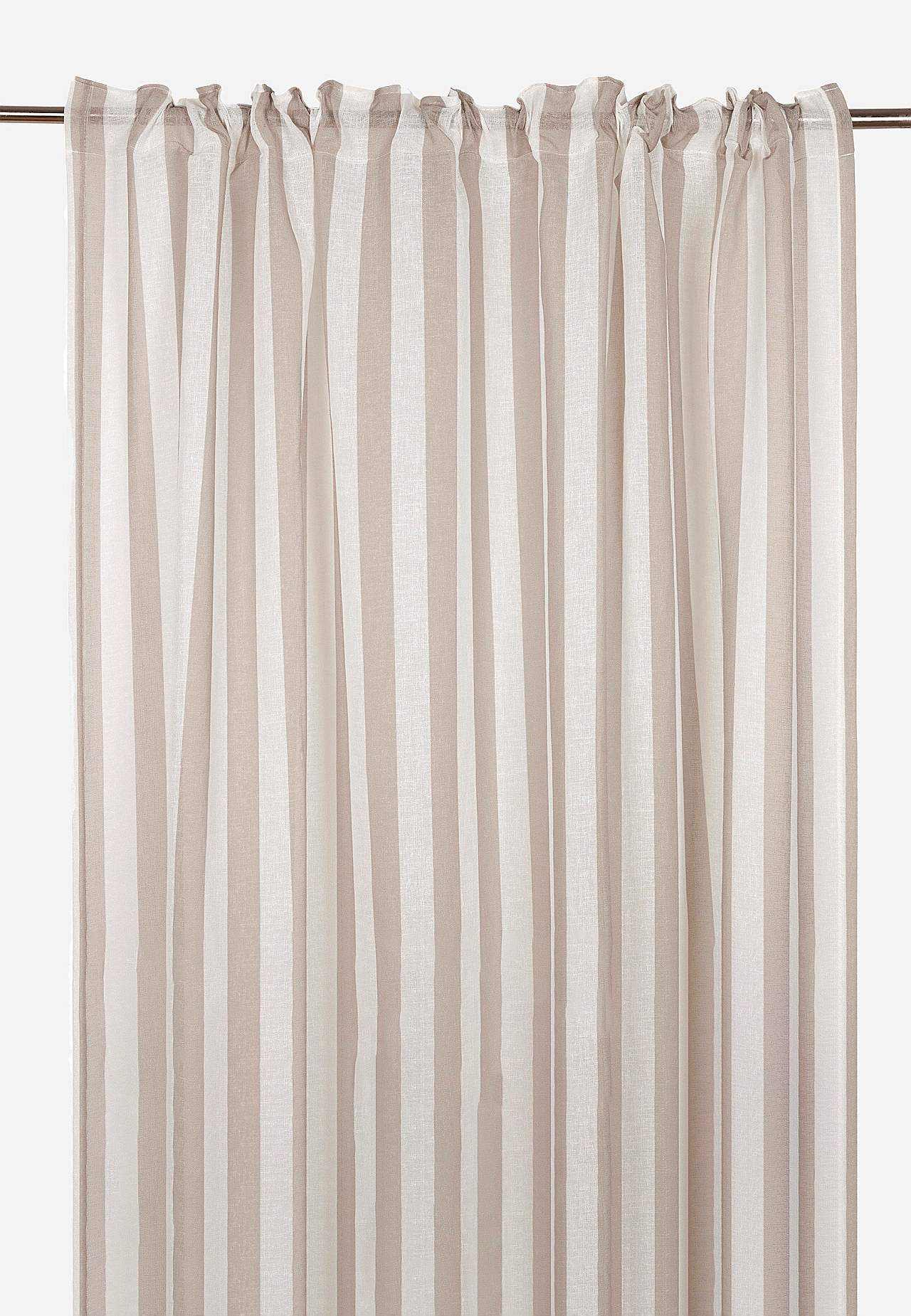 Gardinlengder med digitalt trykt stripe. Luftig materiale med fint fall og fintrådet slubstoff. Bra lysgjennomslipp. Trykket er tydelig synlig på baksiden. Overlocked-linning.