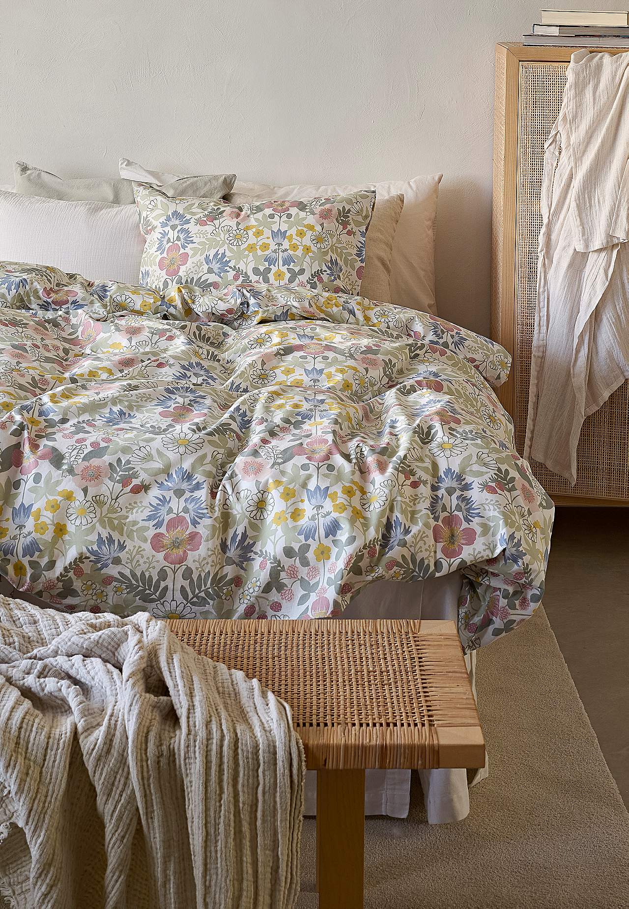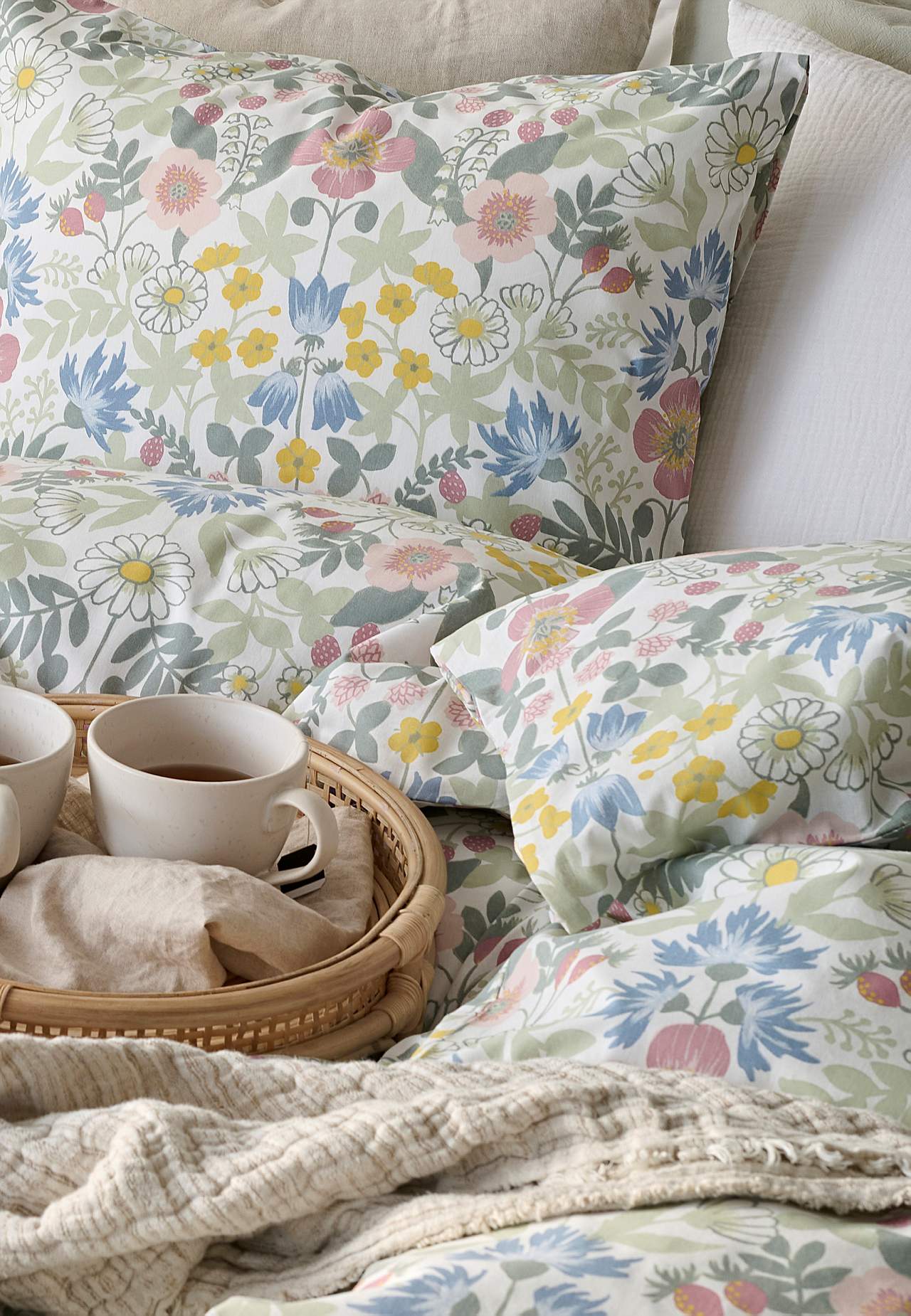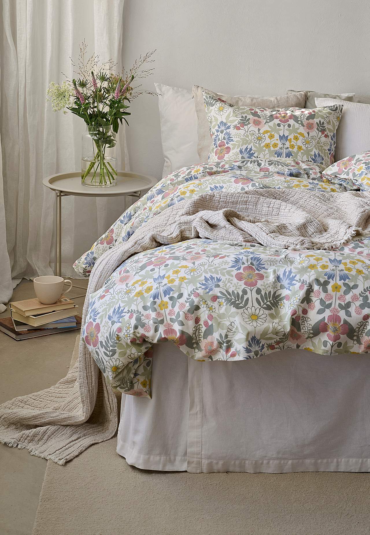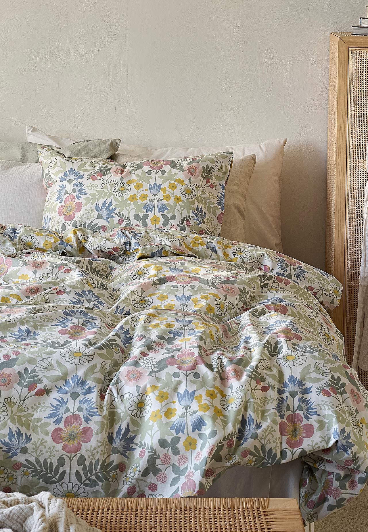 Dynetrekksett i myk, komfortabel bomull. Trykket sengesett med småblomstret mønster og ensfarget bunn. Samme mønster på frem- og bakside. 2 deler. Dynetrekk i størrelse 150x210 cm, putetrekk 50x60 cm. Dynetrekk med håndhull opptil. Putevar med konvoluttåpning. Trådtelling: 144.