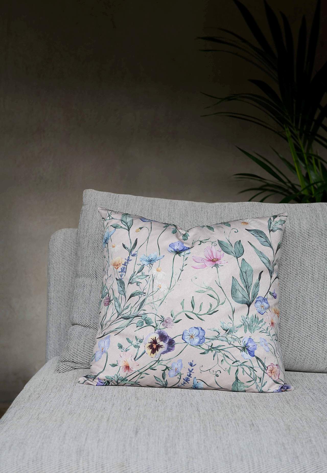 Putetrekk med romantiske blomster, kronblad og buktende stilker. Mykt fløyelstoff i polyester. Samme mønster på frem- og bakside. Lukking med glidelås i siden. Størrelse: 45x45 cm.