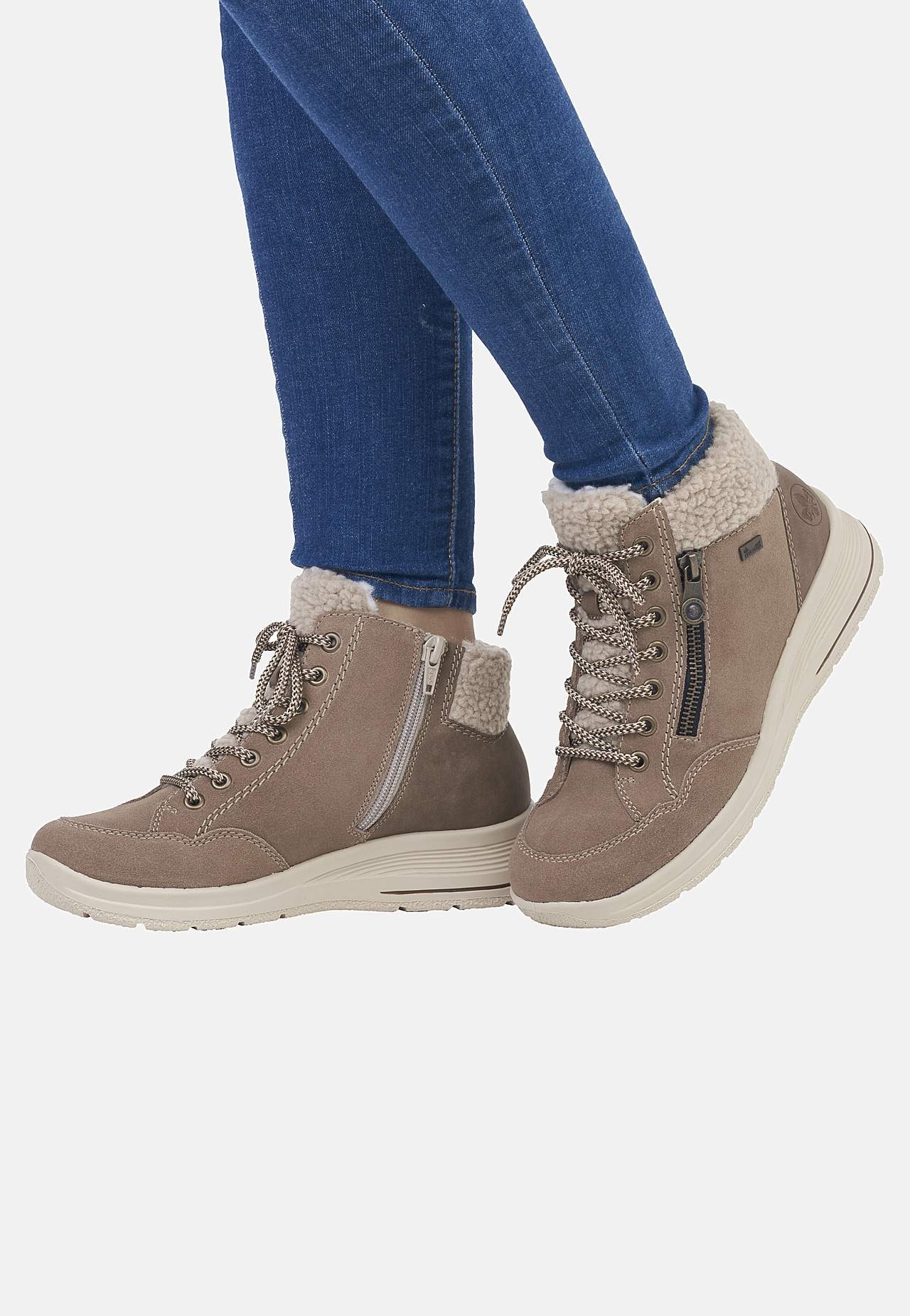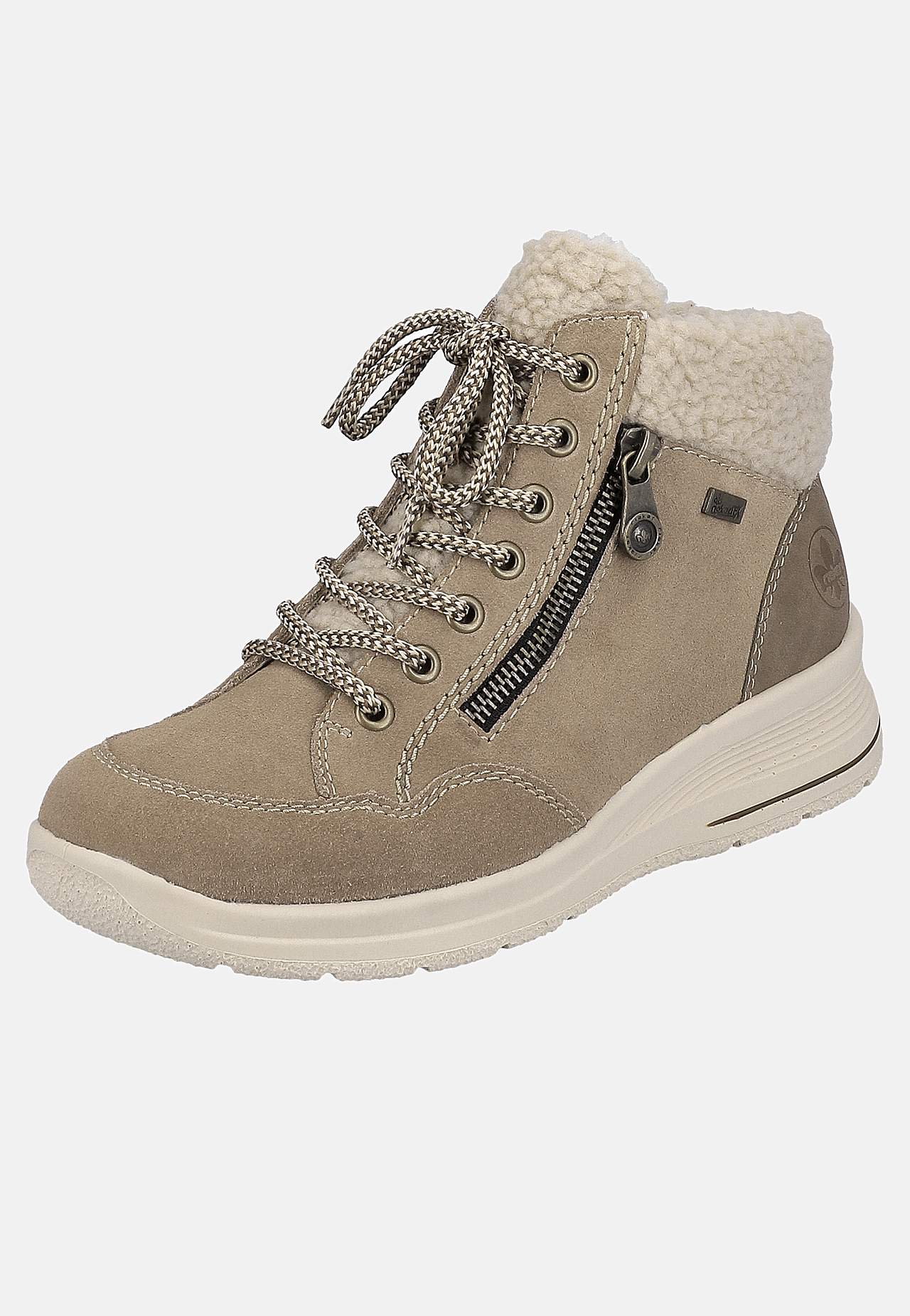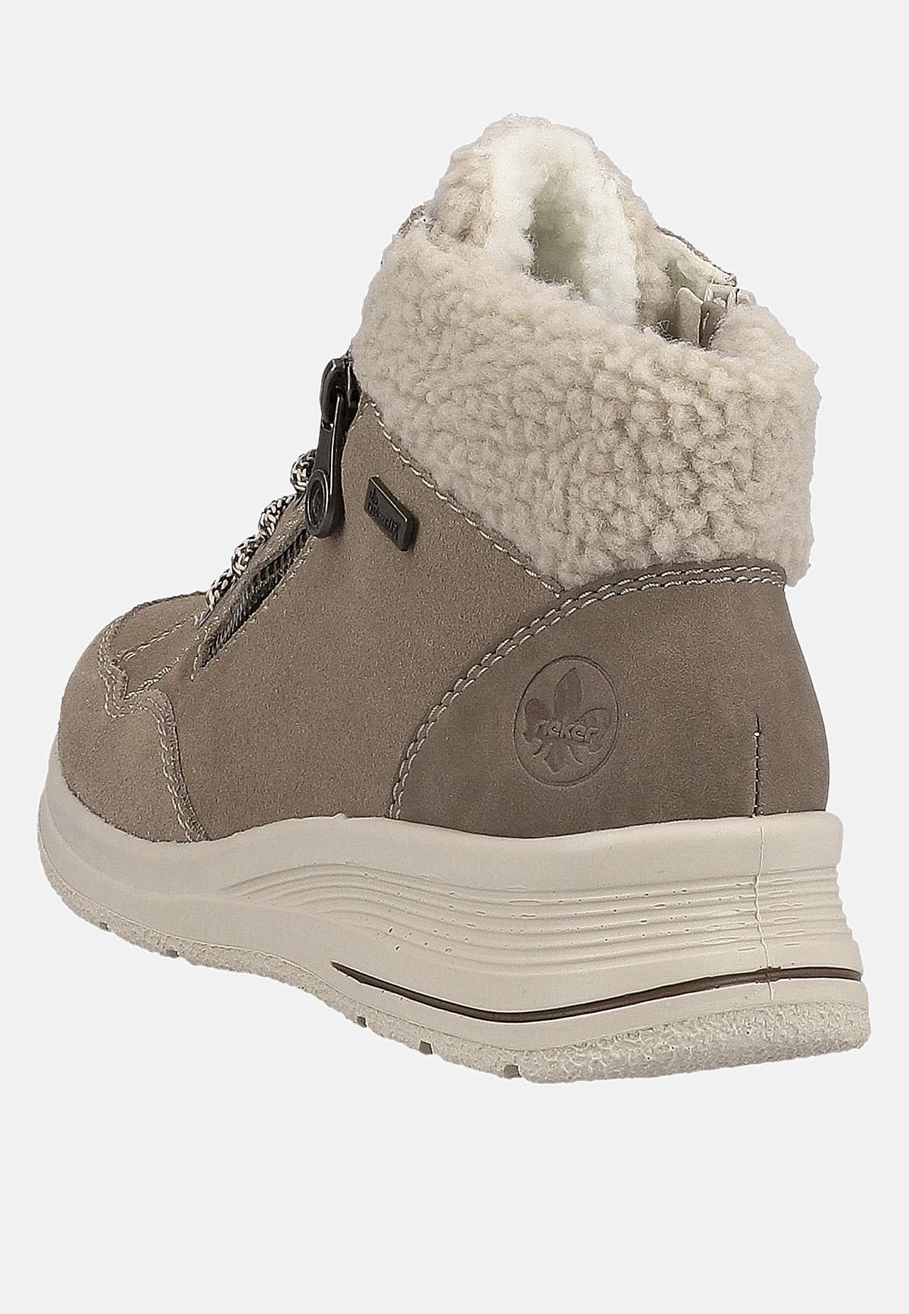 Vannavstøtende, varm-foret semsket støvel. Snøring på topp. Glidelås på innsiden for å enkelt ta av og på. Dekorativ falsk glidelås på utsiden. Mykt, varmende, fluffy, hvitt fôr. Beige kant i fuskepels. Grov yttersåle for bedre grep. Rieker Antistress: Se nedenfor. RiekerTEX: Se nedenfor. Overside i skinn. Fôring i tekstil.... Les mer