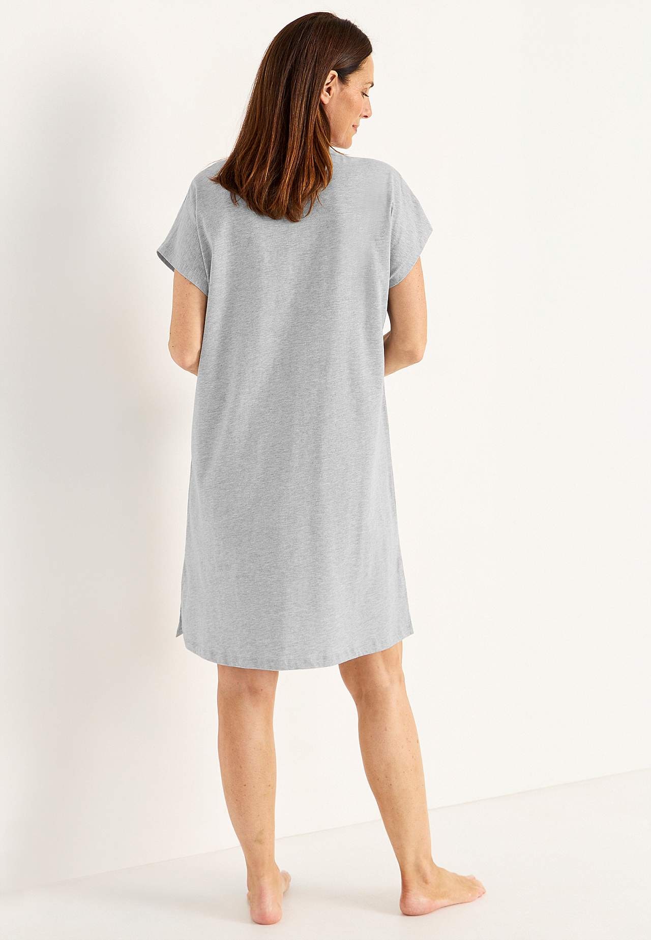 Kort nattkjole i myk organisk bomull. Romslig passform. A-linjeform. Rund hals. Korte holkermer. Rett fald med splitt i sidene. Lengden følger størrelsen, ca. 95-105 cm fra skulderen bak.
