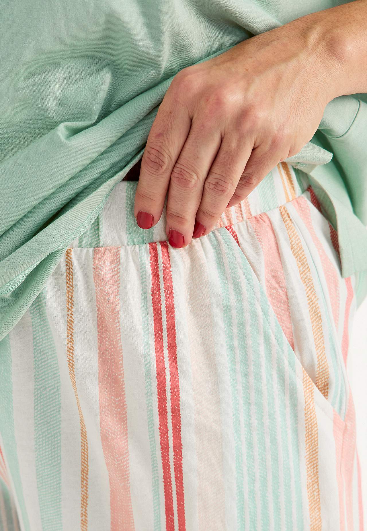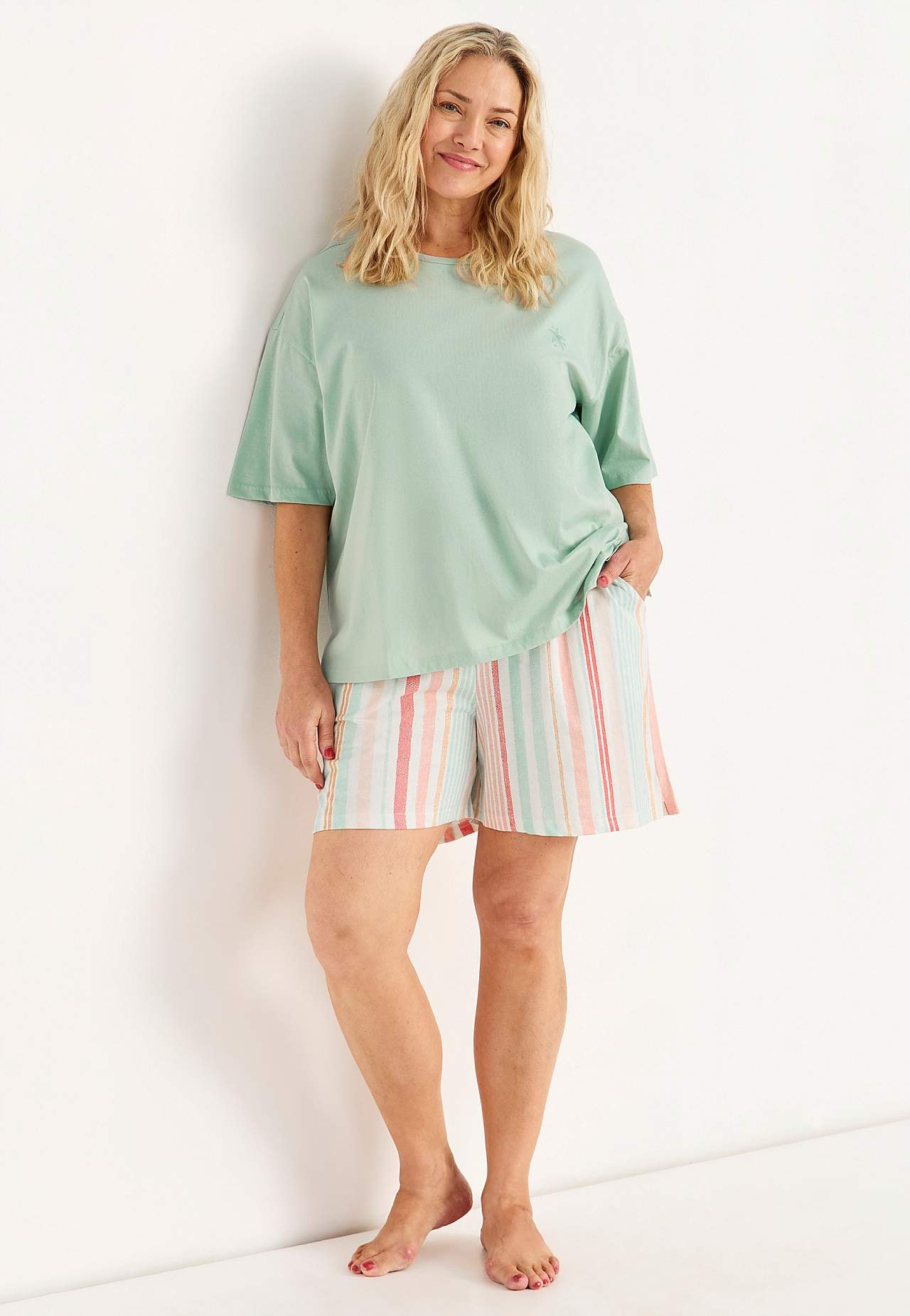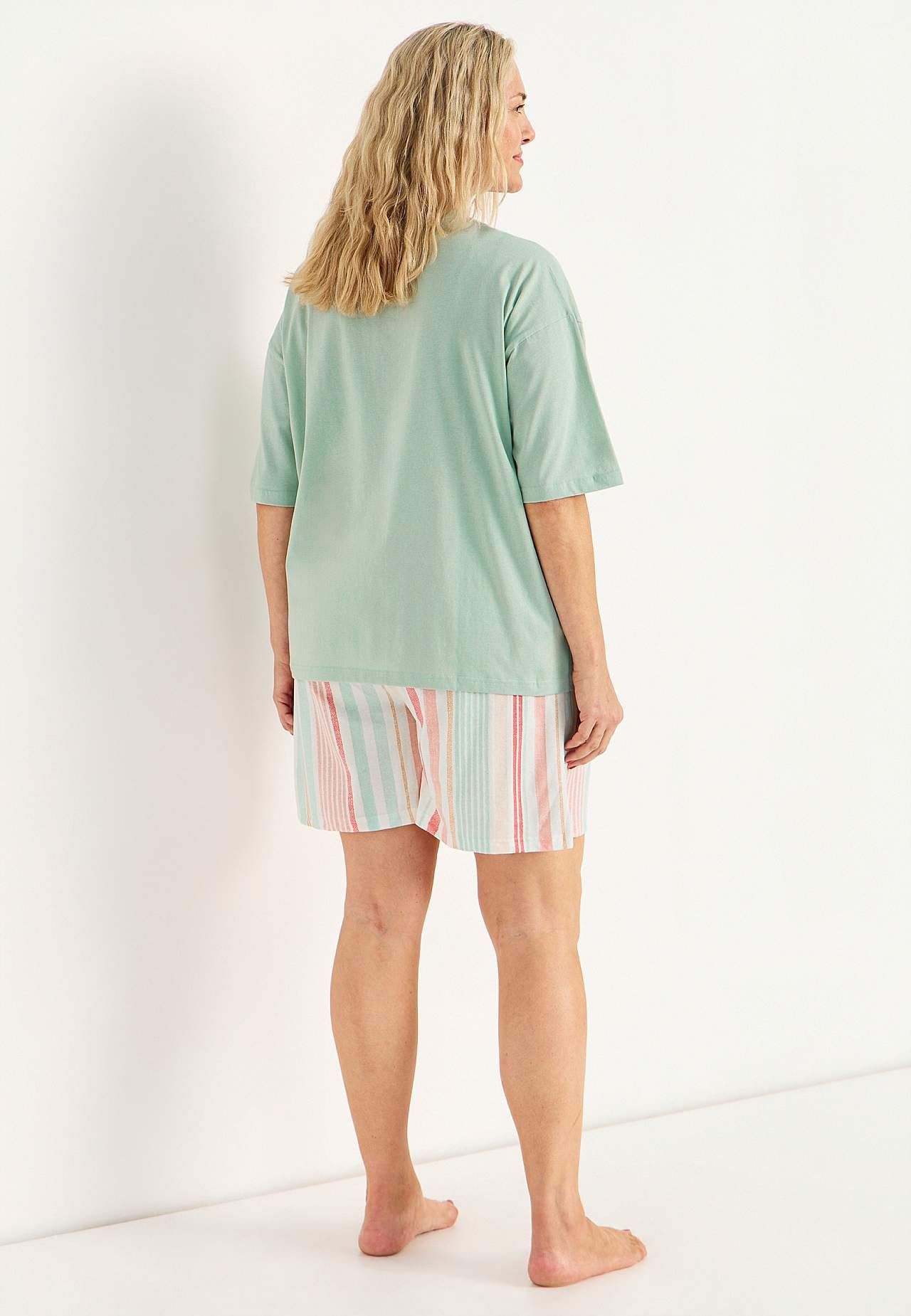 Pysjsett med topp med korte ermer og shorts. Myk, økologisk bomull. Normal passform. Øvre del: T-skjorte med lett nedtrukket skulder. Liten broderidetalj i samme fargenyanse på venstre side. Korte ermer. Rett fald med splitt i sidene. Rygglengden følger størrelsen, ca. 63-73 cm. Nederdel: Shorts med vidde. Myk elastisk stro... Les mer